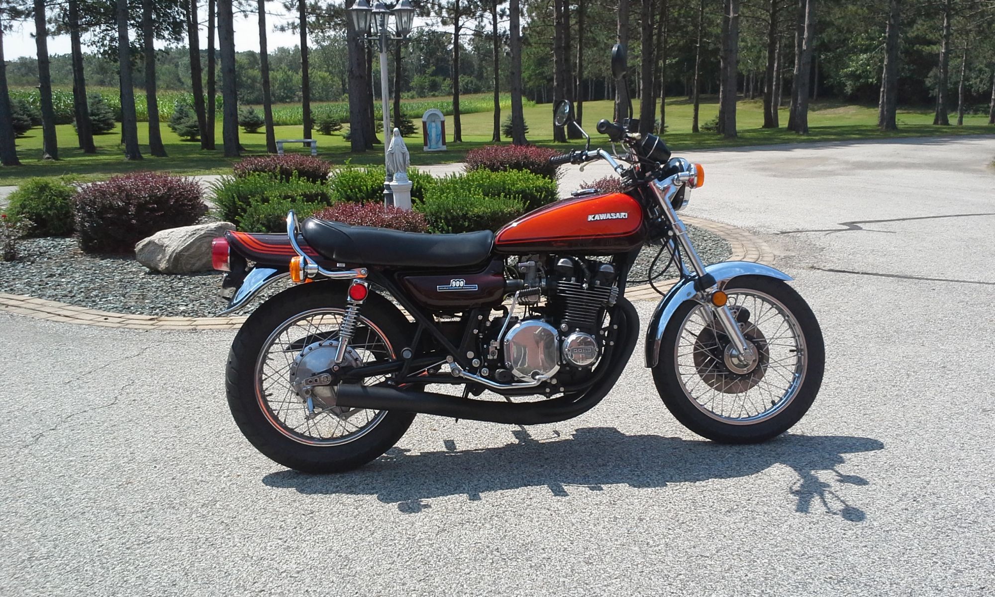 74-75 z1 non stamped new in crate factory replacement engine{comple} bolt in and restored 75 z1 . I have old friend who passed away a few years ago he spent his entire life working at a kaw dealer as a mechanic and a local drag racing legend . Were talking 30 years of Kawasaki 900 experience . His widow has a z1 non stamped z1 in the crate engine,small 6mm exhaust studs, z1 motor. 1975 z1bike restored 4-4 pipes are kz 900 few holes in one pipe other three perfect . Over the counter genuine Kawasaki super blue body set tank has wrong outside seam. Other then a few rust holes in left lower pipe Bike is MINT I mean MINT relaced wheels airbox nos gauges and hand switches list goes on .It was on a classic motorcycle calendar a few years ago . Bike restored with all genuine oem parts . Bike and crate engine . Lets guess