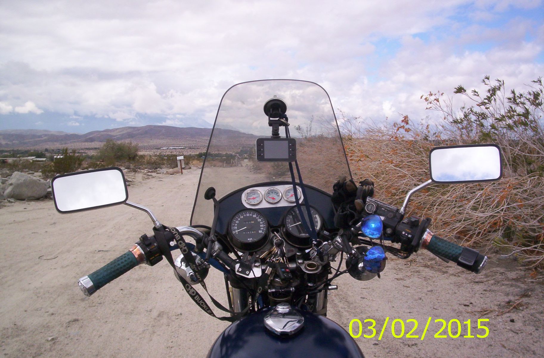 It's on the windshield. It has a anti shake function. I can set it to 5,10 or continuous loop. Still learning how to use it. The plug in adapter takes a lot of juice though thus discovering low charging issues. I'll post a pic of it mounted. I need to buffer the sound, It's bounced back by my boxes then amplified by the windshield. It's curved like a dish. MY BIKE DON'T SOUND LIKE THAT!