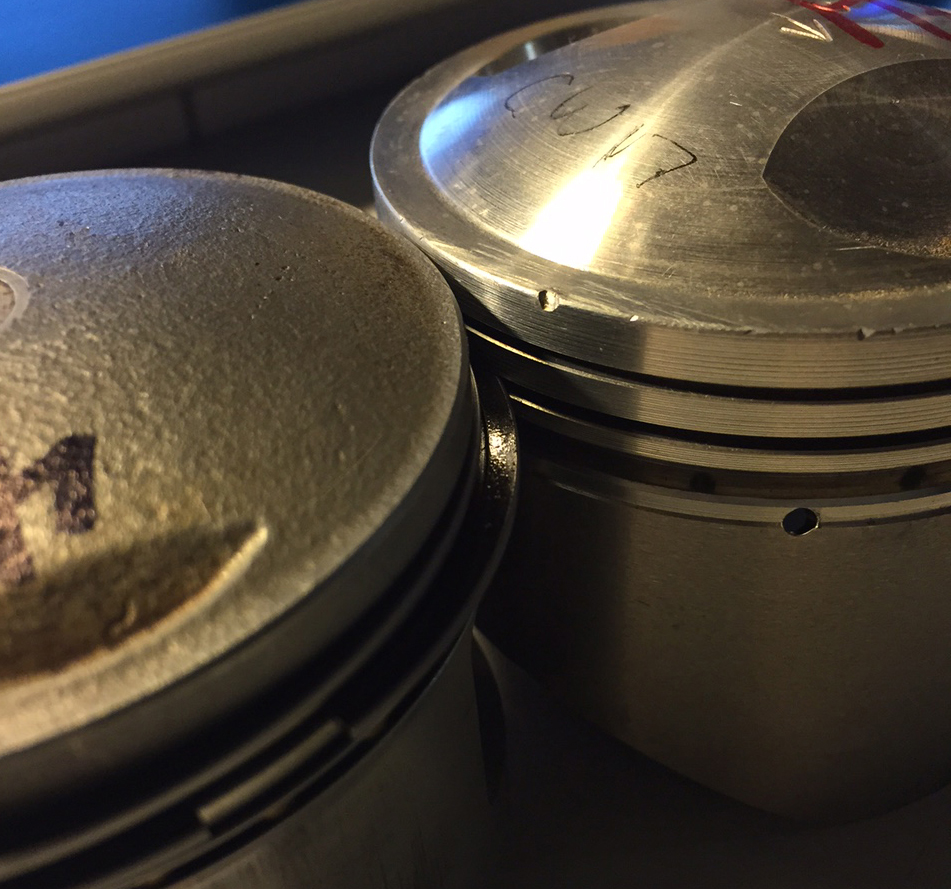 I knew reusing the rings would be iffey and it was burning a small amount of oil. Not bad after two years. The stock 1015-8.5/1 pistons are pretty clean comparitivly. #2 was burning the most oil as seen by the clean ring around the outside top of the piston. Time to stop, take a break, then go out and measure the deck height.