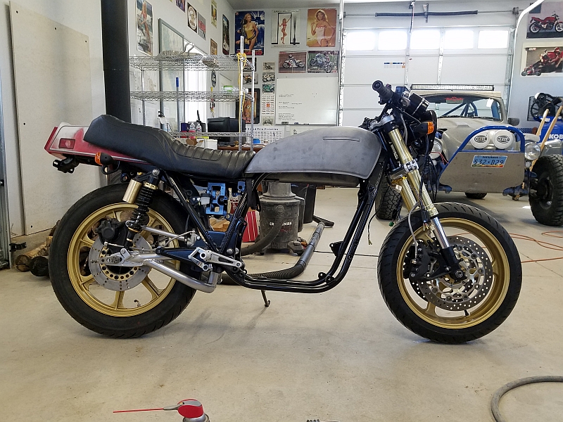 I have been friends with the original owner since the early 80's. We met at a mutual employer since we were both motorcyclists we became friends, and riding buddies. After 35 years of friendship, he was about to retire and move out of state. He had parked the bike alongside of his garage and quit riding it in 1991 for unknown reasons. And there the bike sat for 28 years. I asked him what he was going to do with it, and he volunteered to give it to me for free as a retirement gift if I was willing to haul it away (free is always a great starting point but it doesn’t stay that way for long !!) I had found my first retirement project! Bound and determined to rescue this motorcycle, I set off on the journey of frame-off restoration/resto-mod. After cleaning the crud off and forging a clear vision of where it was going, It took 3-1/2 years of work to bring it back to life, with nothing left untouched. I was a big road race fan, so the project turned into a 80's superbike theme, with a nod to one of my favourite riders - Eddie Lawson. The original swingarm has been braced and the front end replaced with one from a CBR600RR, to allow the suspension to work to it’s best the frame has also been significantly braced. The motor is fully rebuilt with high comp pistons etc and the stock carbs fully rebuilt. This is Steve’s vision of a 750cc version of the KZ1000 ELR!