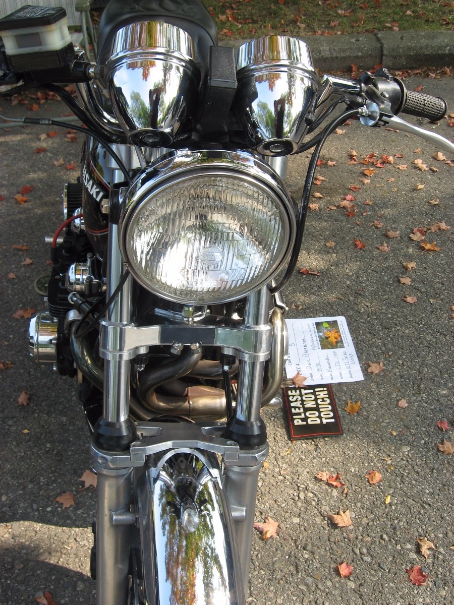 Front brakes have stainless steel lines from Z1 Ent. and the neatest piece on the front end are the custom fabricated Triple trees with the built in dual brake splitter made for me by Les Holt at PDM . They are very well done and strong as hell . Really stiffens up the front end along with the fork brace.