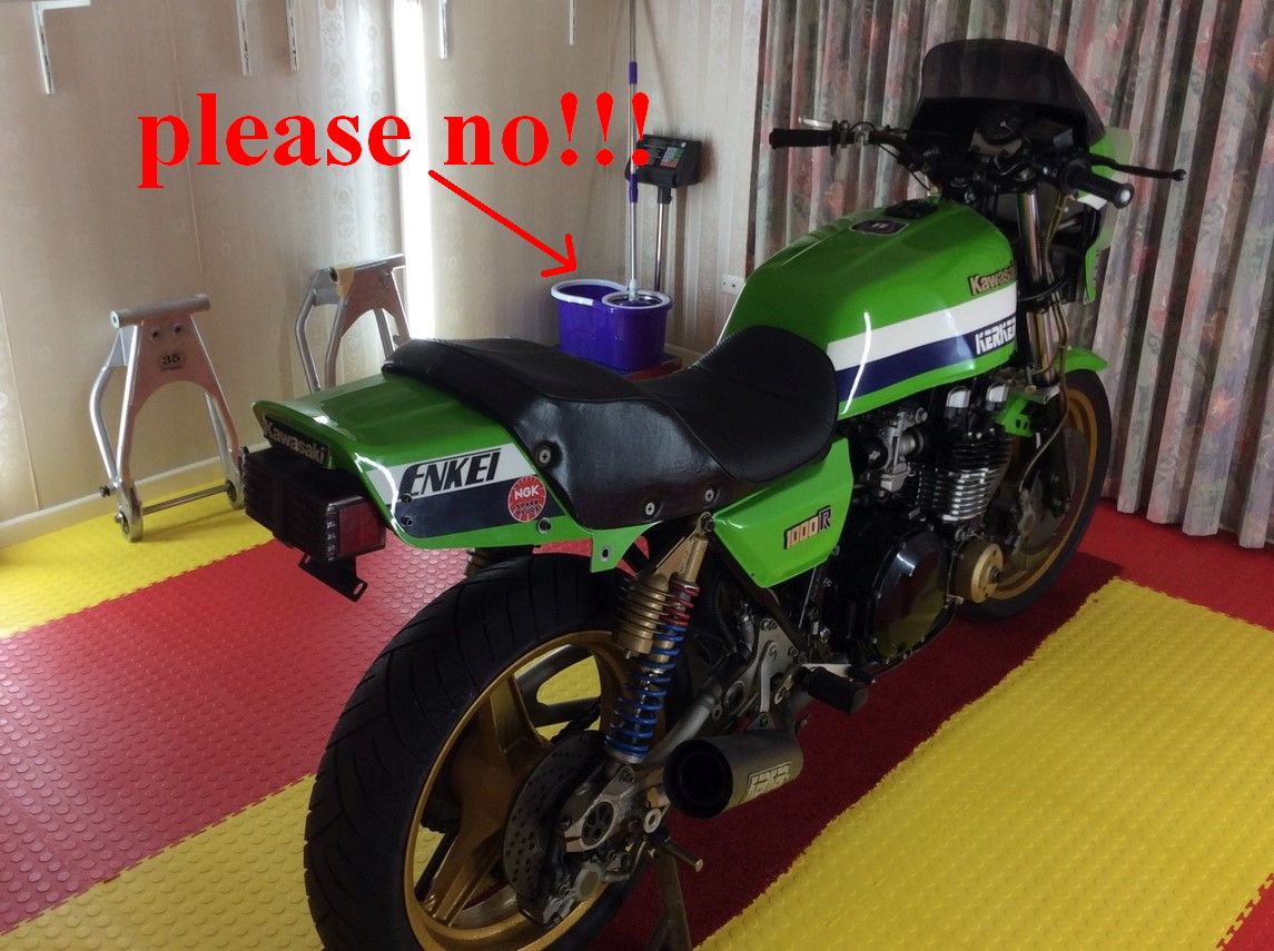 Sorry for late reply, Scirocco - been away from the pooter ( computer ). I am not one who takes a lot of photos, I have the original Ebay photos the seller put on, some photos when the transport truck unloaded the bike at my place before it got pushed into the house in daylight and a couple of photos inside. I could post some of those if you like, I suppose. Right now the bike is about 1/3rd pulled apart - started in Winter ( here ) but when the weather got warmer ( you know, 108-112 degrees... ) I went outside to work on the race car, got its first run just before Christmas, had it for 18 months...!! As for starting it, ain't gonna happen. This engine hasn't been started in over 25 years!!! Quick question to you - why the comment and arrow pointing towards the mop and bucket? That is there because I wipe down the race deck tiles in the bedroom that the bike sits on, they get a bit dusty with time. Do you have an aversion to cleaning products....?