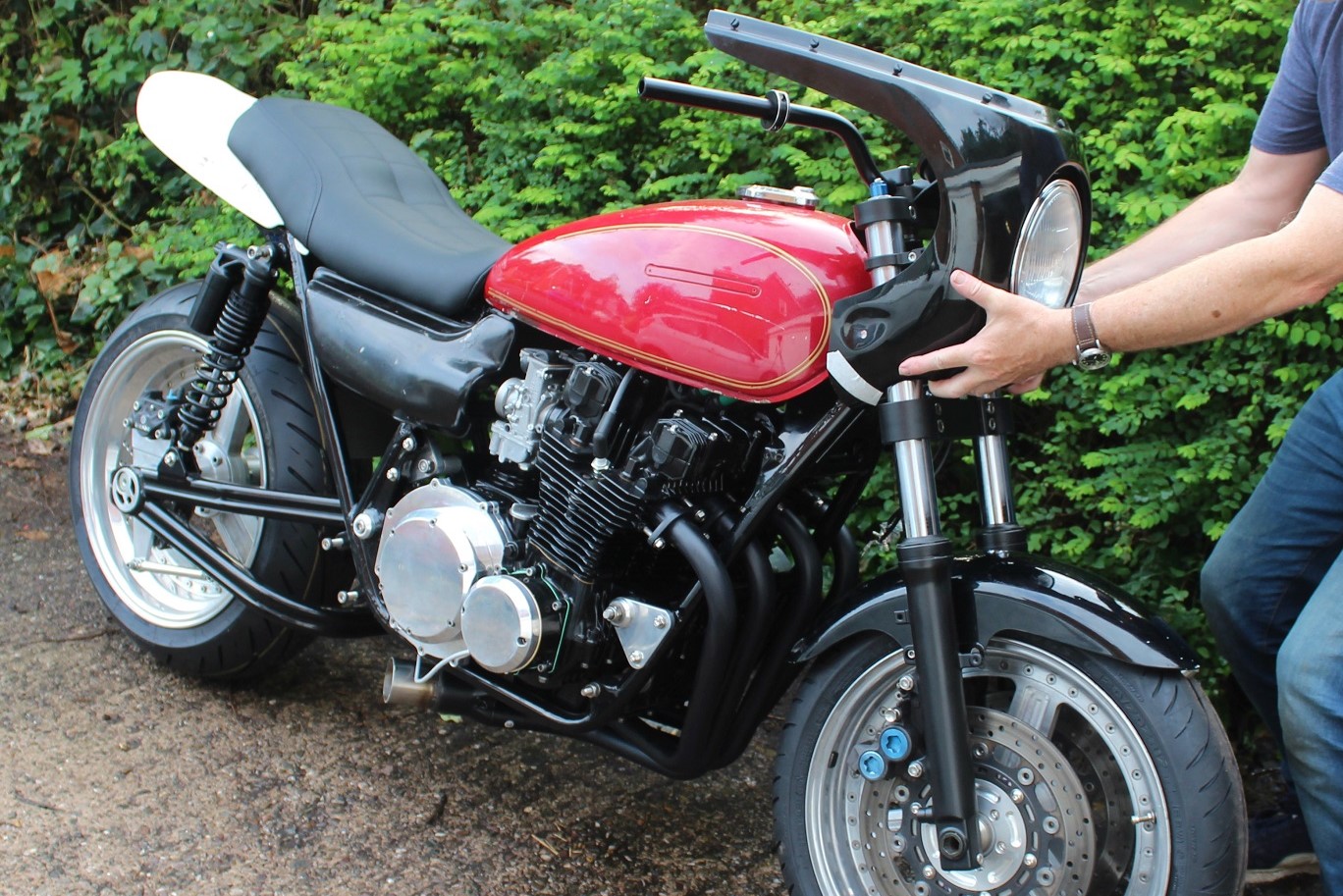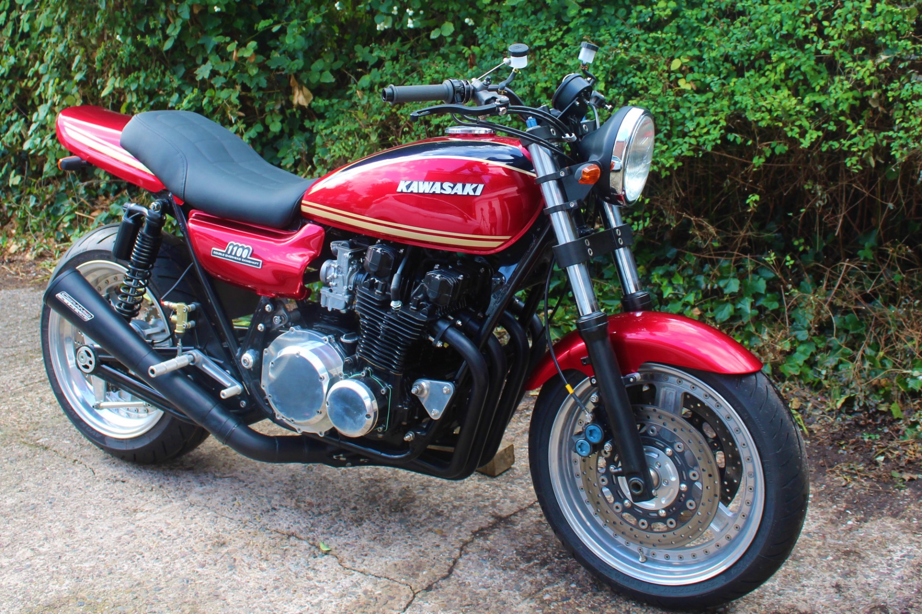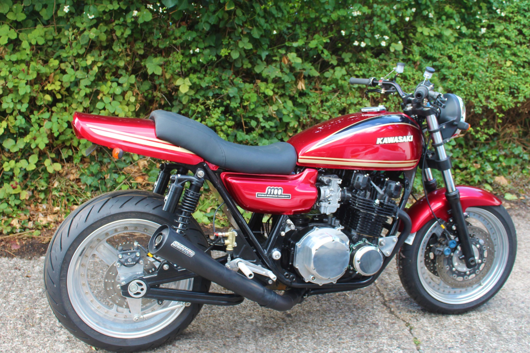 The project started with a badly 'bobbed' 1978 Z650 frame, GPz1100B1 engine cases, Z1000 tank, and not much else. The project belonged to a good friend, who'd already cut the rear part of the frame to widen it to accommodate a wider modern rear wheel and tyre, without the need for spacers on the shock top mount. The frame has now been braced to cope with the extra power and now uses a 20mm swingarm spindle.<br />Since the frame had been widened, a standard seat and ducktail would not fit, therefore a new seat base had to be made in fibreglass and the tail piece widened. The seat then went to specialist upholsterer who did a good job, except he'd got front and back mixed up!! the assumption was made (don’t ever do that) that it was obvious which was the front and which the back, but apparently not.<br /> Bodywork is early Z1, but the tank is from a Z1000. Paint is similar to OE, but with a few changes. For example the upper tank stripe is dark mica blue, not black, to match the blue of the front callipers. The plan originally was to fit a cockpit fairing, but the BMW R90S fairing that was purchased didn't look quite right, so wasn't used. Lee has a “Z900RS café” fairing on his Z1000A1 build which would look much better on the 1170.. perhaps something for the future.<br />The rear sets were made long before the engine was ready, and turned out to be too low, so Lee had to make new mounts to raise the pegs and clear the exhaust. The latter is a Delkevic, whose 4 into 1 collector had to be cut and widened to clear the now wider back end of the bike. Since it had to be cut, Lee also altered the silencer to a jauntier angle.<br />The front end consists of forks and brakes from a 2001 Yamaha R6, in one off billet yokes. The back end uses ZRX 1200 swing arm, Brembo rear calliper on a one-off mount, along with K-Tech shocks built for the bike by the factory. Wheels are also one off split rims, made for Lee’s old drag bike by a friend (the one who sold Lee the project).<br />The engine was taken out to 1170 cc using Wossner forged pistons, the crank has been balanced and welded, while carbs are Mikuni RS34s. Clutch and points cover are home made, as are the rear sets.. levers pivot on roller bearings, hydraulic clutch conversion, and an gearbox output sprocket outrigger. The latter has been causing Lee problems as it has an oil leak, but then he had to use a “home-made” gasket, and that could be the problem.. Lee is still working on that. That's why in some pics the chain has been removed, as Lee was working on the outrigger inner plate at the time.<br />Wiring is done by Lee using a “Moto-Gadget M-Unit” which helps simplify the wiring, along with their matching switchgear. Ignition is Dyna S with Dyna coils. It has an electronic Daytona Velona combined tacho/speedo gauge. <br />Brake and clutch master cylinders are by a UK company HEL, as are the brake lines.<br /><br />Once the outrigger oil leak is fixed and the engine is run in, Lee will take it to a dyno and have the carbs dialled in, but it was snowing at the time of writing, so that will have to wait until the spring.<br />The build was without doubt the most frustrating Lee has done, as there were countless problems, while Covid lockdown didn't help. The engine case was found to be cracked, after they had been ceramically coated at great expense. Thankfully they were repairable.<br />