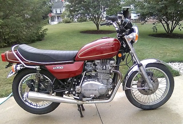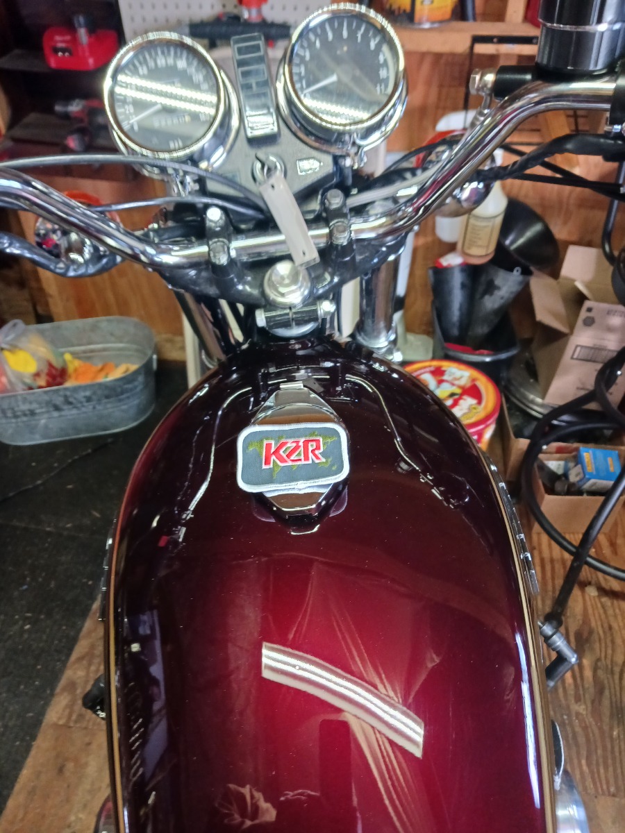 I tore it down to frame and engine after a scrub and pressure wash. Then in no particular order- with help from close friends Jeff & Rob Cleaned out & sealed fuel tank, rebuilt carbs & removed oil pan to ensure that take-up screen wasn't clogged. Adjusted valves repacked wheel bearings and fitted new tires and tubes. NOS 1 pc. cush drive rubber, rebuilt brake callipers & Installed master cylinder/lever from a 2009 650 Ninja to get brake light switch on the lever instead or the inline hydraulic switch.