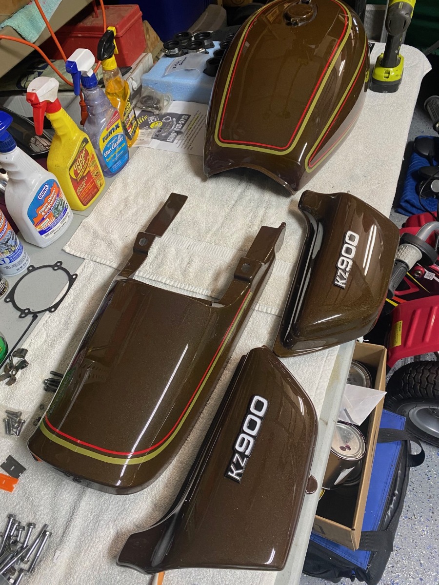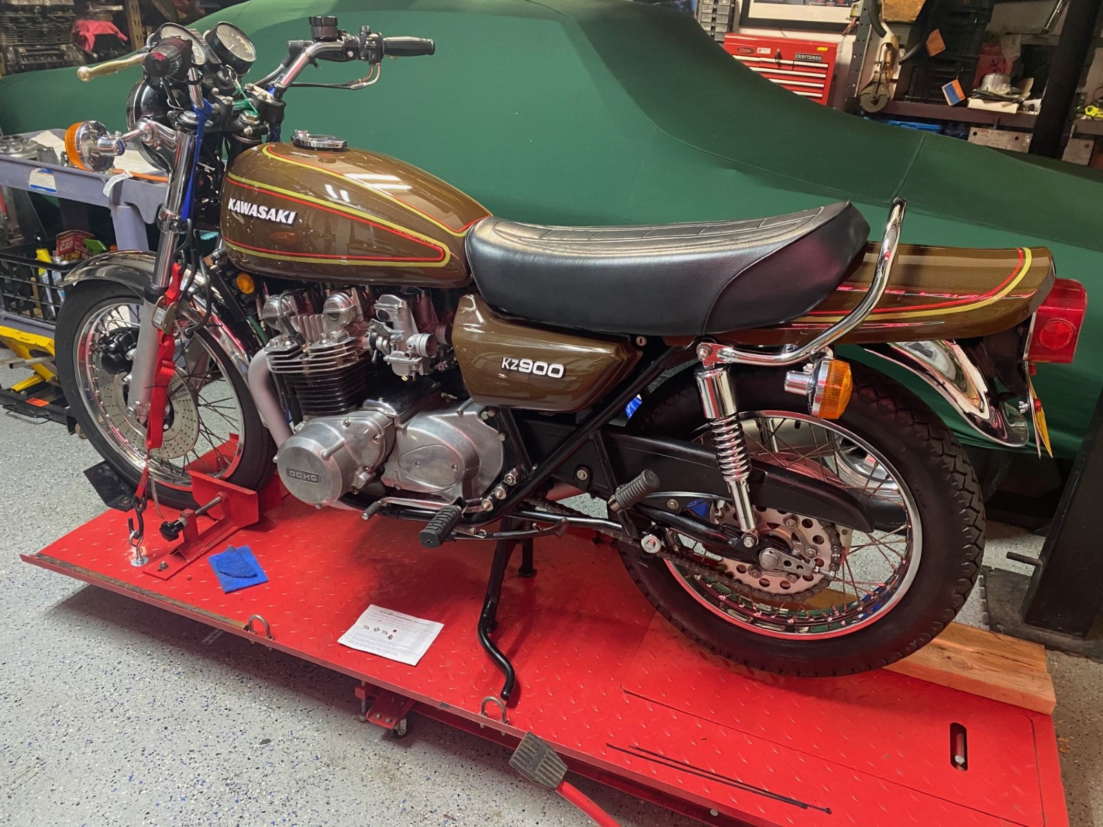 It's hard to believe April is already here, staying in the USA this month for another offering from Jim (wheelhop) another great example of the beloved "Big Z"Wheelhop’s 1976 KZ900 A4I was visiting one of my online muscle car websites in the early winter of 2021. I was looking at the story of a guy I am friends with in Pennsylvania who bought a low mile 1969 Chevrolet Camaro SS L78. The early pictures of the car in the original owner’s garage in Sand Lake, NY showed a few (3) motorcycles in the front corner of the garage. I called to ask what they were and he gave me the previous owner’s phone # and I gave him a call. He had said one of them was a 1976 KZ900 and I asked him if he’d be willing to sell it and a deal was made. I went out there in Early January of 2022 and brought the bike home in the back of my pickup truck. The bike had been modified and had larger pistons (1200 cc I was told) 12.5 to 1 compression, cam, welded crank,mag wheels, magneto distributor, 33 MM smoothbores, and a Daytona Performance exhaust. With the added HP It had sheared a woodruff key off the crank in the early 1990’s and had been sitting in his garage ever since. The mileage on the clock is only 12,034 miles and is believed to be correct.With some great advice from guys on this site (including Zed1015) I was able to “lap” the end of the crank with valve grinding compound and install a new woodruff key. The 33 mm smoothbores were sold along with the Lester rear mag wheel in order to help pay for original Takasago spoked wheels and a more civilized rebuilt (by Mikaw) 28 mm Mikuni “pumper” carb. I replaced the “bulbous” seat with a very nice original from a 1977 KZ1000. The tank and body set were removed and sent out to get stripped, and re-sprayed back to 1976 original color, Diamond Brown and decal/stripe kit was applied and cleared. The rest of the bike was completely original (frame, front fender, harnesses, handlebars, controls, etc.) and just needed a thorough cleaning. The bike was brought up to Zukey Lake (thanks Dirk Digler!) in fall of 2022 and fired up for the first time in approximately 32 years! Many thanks again go out to all the great KZrider.com members who helped along the way.