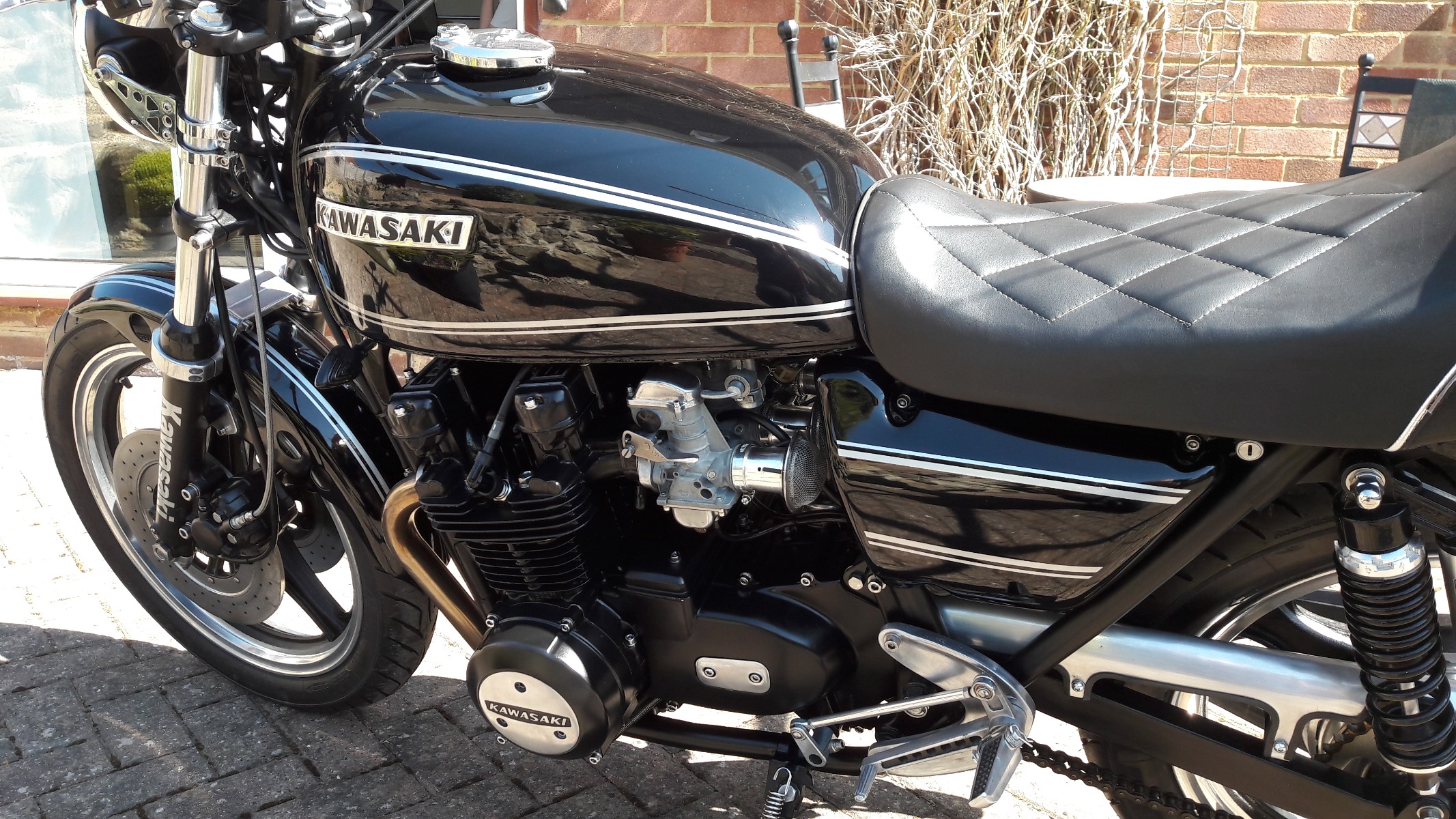 Originally bought unseen for £500 as a parts bike should I need anything for my all original green 650 B1 but everything on the green bike was sooooo much better condition than this bike. (pic1). So with a stash of parts that I had accumulated over the past 40+ years I decided to build the 650 I wanted in the 70's but didn't have the money or engineering confidence to do it back then. So first was a complete engine rebuild. Adding in piper cams, piper high compression pistons, skimmed head, cosmetic head gasket but still stock 652cc. Resulting in a compression of 220-230psi.Complete engine paint using simonez tough satin black. Stock vm24 carbs jetted to suit with stacks and tea strainer mesh filters. (pic2). Back in the 70's the exhaust of choice was a piper four into one but they rotted out pdq so finding one was next to impossible so I made a stainless replica and added a Moriwaki badge for bling. (pic3). Wheels are CMA race mags off a 900 at about half the weight of their road mags. Dresda box section swingarm. Forks are stock which have been altered to accommodate adjustable preload (pic4) and progresive springs. Ohlins on the back. Converted to twin discs which I surface ground and swopped the callipers to behind the forks with ebc red stuff pads with braided stainless hoses. (pic 5)Foot controls were originally period Raask but hated the levers so made some new ones to my liking. (pic 6/7) and added in a spacer to lower and move the footrests further back. Instruments couldn't stay standard but keeping with the period or home built parts only theme, the stock speedo stayed but the idiot lights changed to individual led's and a mini 2 inch rev counter all housed in a ally housing. Pic 7It's one of those bikes which is never really finished as it gets bits and pieces changed or built for it every winter. Then I found an issue with the rev counter drive ratio. When the engine was idling at 1000 rpm the rev counter read 1400 rpm. Apparently Kawasaki are the only ones that use a 7:1 drive ratio whereas the rest of the world use 5:1. That prompted the next little mod! Built a small inline reduction gearbox to correct the ratio issue. Pic 8&9Home made tail tidy, and tucked a smoked lens tail light in under the tail piece and built indicator into it. Pic 10. Relocated and changed the front indicators to a more tucked position and less obtrusive style. Homemade alloy chain guard, pic11. Renthals bars and black base with silver coach lines on all the body work. Pic 12.There's probably loads which I've forgotten to mention.