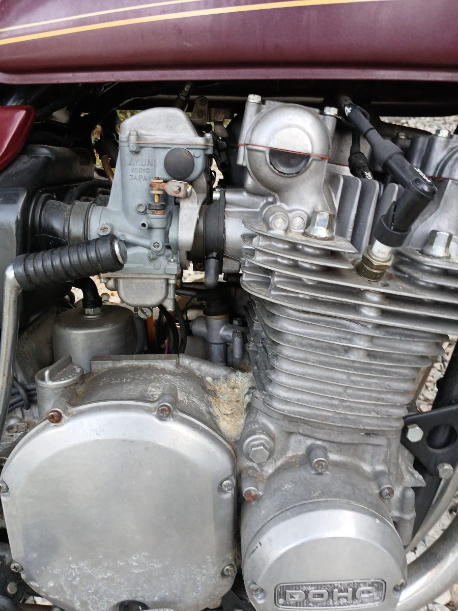 I was dealing with a medium amount of work and expense here: Overhauling the forks and brakes, drivetrain, tires, inner + outer engine-cleaning ,new paint and of course some new parts like intake rubbers on head, and between carbs and air cleaner, rear fender and a full hand of all the "little" hardware, we`re almost need on a restoring