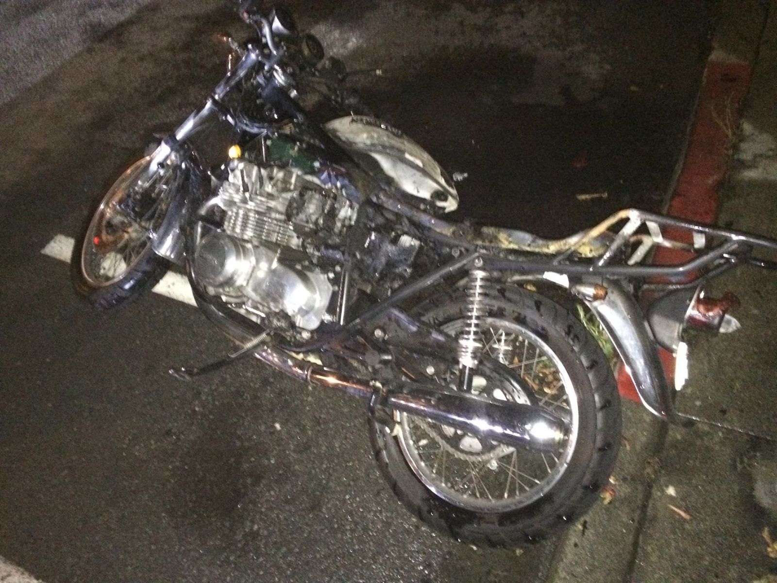 So i came out of class tonight to discover my 650 burnt to a crisp. cops said eyewitnesses saw a man in a hoody was crouching next to the tipped over bike and then later the bike was in flames. They said the arson department will be looking at it. :sick: im not holding out for them even though they were sympathetic... Ill get some better pics of it tomorrow, but the firedamage doesn't seem to be all that bad, most plastic and rubber is toast, but the chrome looks pretty good still. I have been thinking about selling this bike but now i have no clue what i could get for it, any thoughts? I don't have the time or money to fix it right now, so should i part it out out or try to sell it whole?