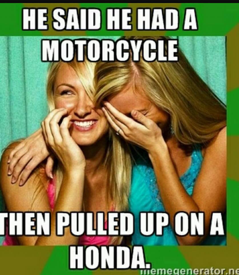 ROFLMAO!!! That Honda one and the girls is WAY too funny!...Heck I still laughin' tears! The only GOOD Honda iis a chopper lol! ................................Mike