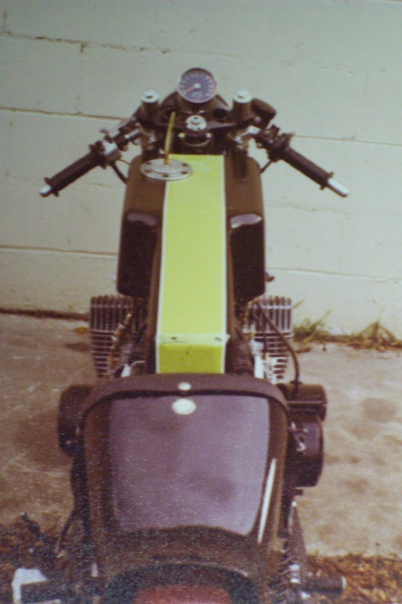 Here is my H2 750 back in '73 with a Monotrack tank. When it was full of fuel, it felt like I had a huge bowl of Jello between my legs!!! Not much of a confidence builder. I knew if I crashed, it would explode like a gasoline filled water balloon!!!!!