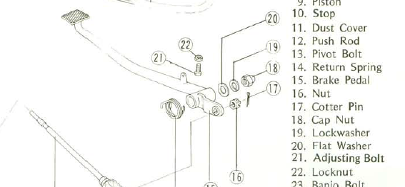 On your back brake, have you checked to make sure that the adjusting bolt( # 21) hasn't come loose and spun out ?