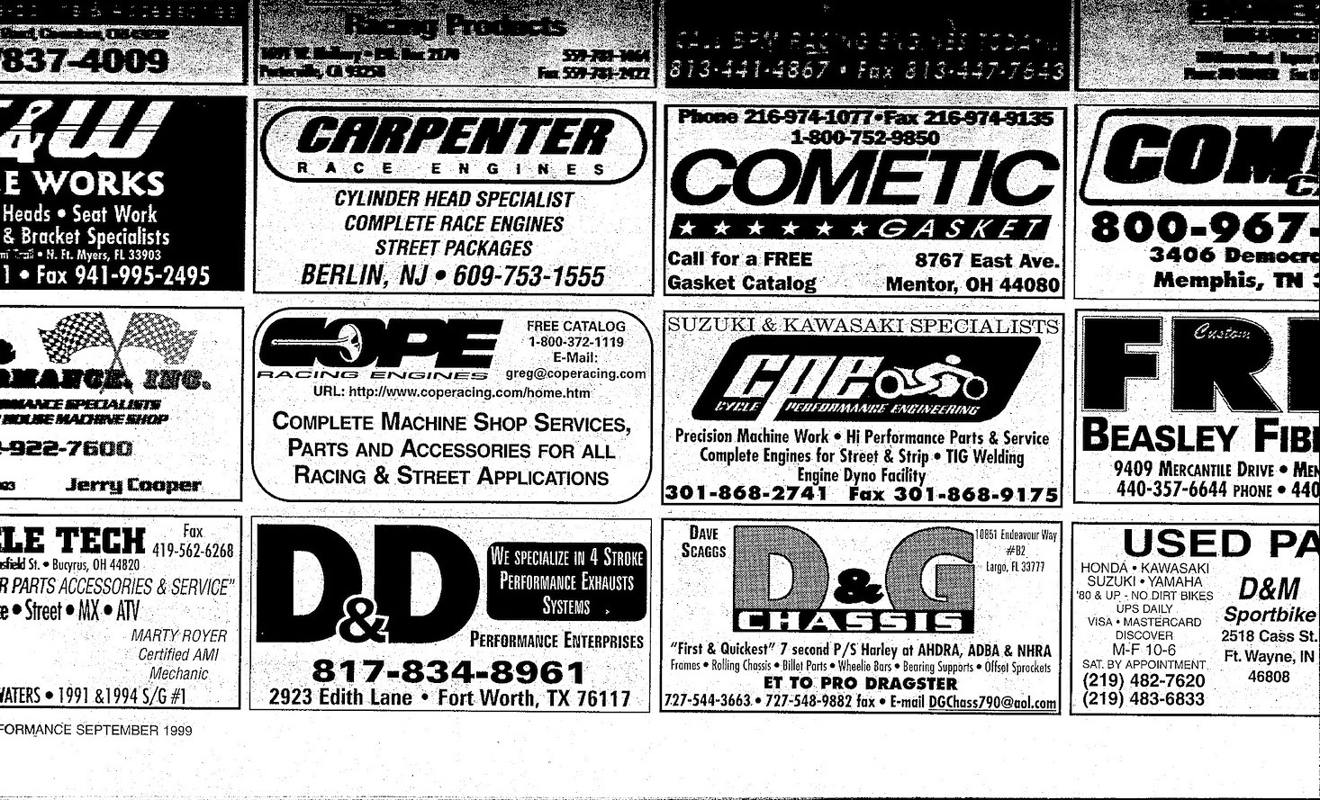 I see a KZ-based motor, with a big block cylinder assembly (maybe 1260 - 1327 - 1395cc?), J-model head, Mikuni flatslide carbs, and an MRE single-stage lockup clutch - a pretty nice package. Don't know a whole lot about CPE. I recall a Pro Stock-level Kaw that ran back in the '90s which had CPE sponsorship. Don't know if the bike was run directly out of their shop, however. Somewhere I may have a pic of that bike and will post if I come across it. Also, I've attached an image of their classified ad, from 1999. Their phone number had a 301 area code which is Maryland/DC area. Please keep us updated with any further details.
