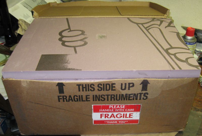 Lid cut open, avoiding the hot-glued flaps. A large piece of the foam board packing is seen on top.
