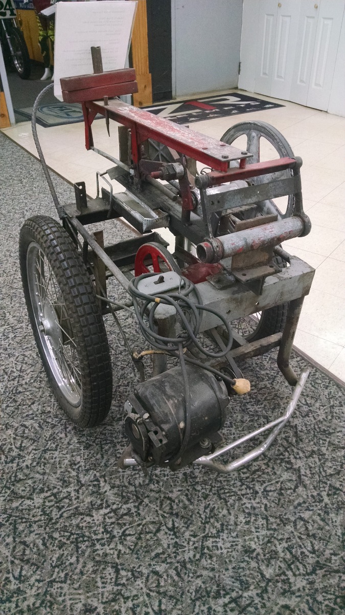 This home made power hacksaw caught my eye. If you look close you can see the different motorcycle parts used in the construction, powered by an old Matag electric motor.