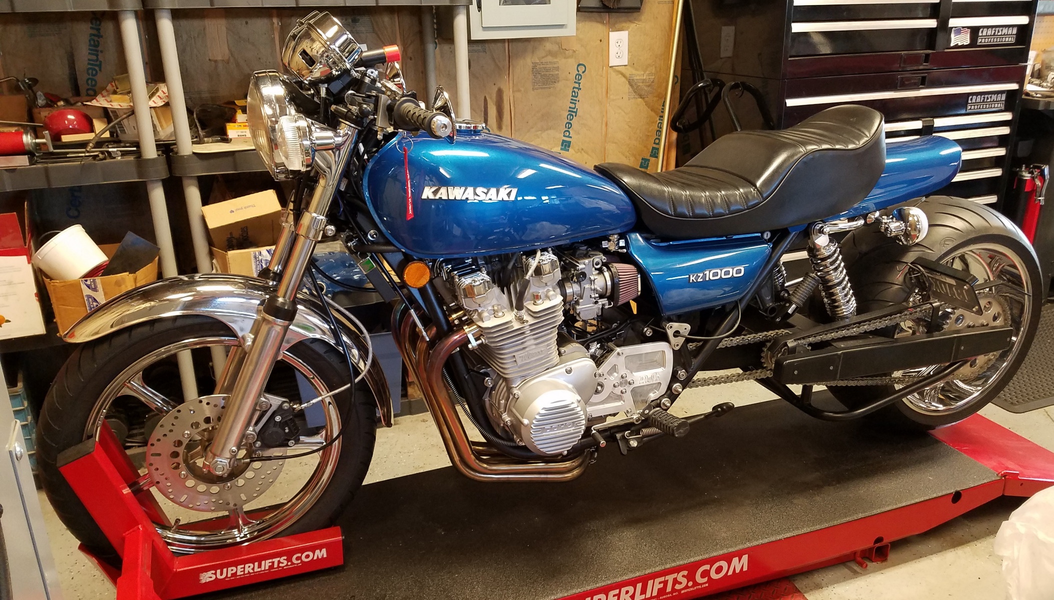 Actually, once I get the muffler done, it's done. I did from bare frame chemically stripped and powder coated. Every small piece powder coated or chromed. Every nut, bolt, washer replaced with stainless or titanium. It's an absolute new 1977 KZ1000. Even front wheel was from a EX305 that was painted stock. It was sent to Paul's chrome and $600 later it with the brake setup took almost 9 pounds of of the front end. Measured and measured to get all to work together.