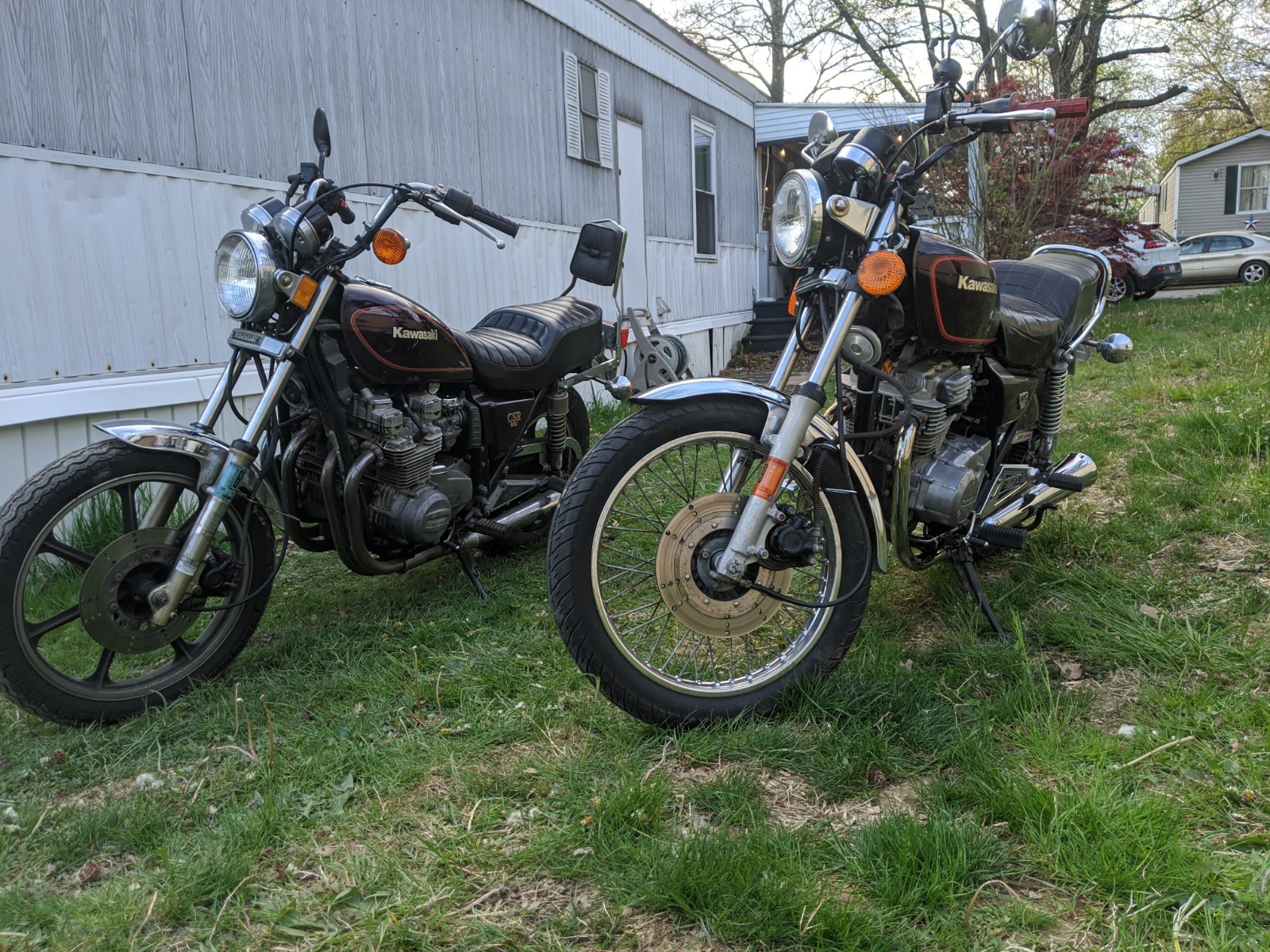 I know it doesn't sound like a project, in fact it just sounds like regular maintenance, but this bike is my first bike and ultimately first project bike and I wanted to see what I could handle. I am posting this as a thank you to all of the forum member that have chimed in on my questions and gave me really solid answers. I have learned so much over this past month. There is really no before and after photos because the bike untimely looks the same from when I bought. Other than a few coats of wax. But I have a few photos. One is next to my buddies kz305. He also was a huge help. Thanks again everyone.