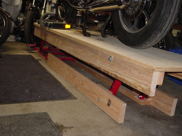 I removed the wheels, welded nuts on and screwed in bolts for adjustable feet when lowered. It also makes a good work table when there's no bike on it.
