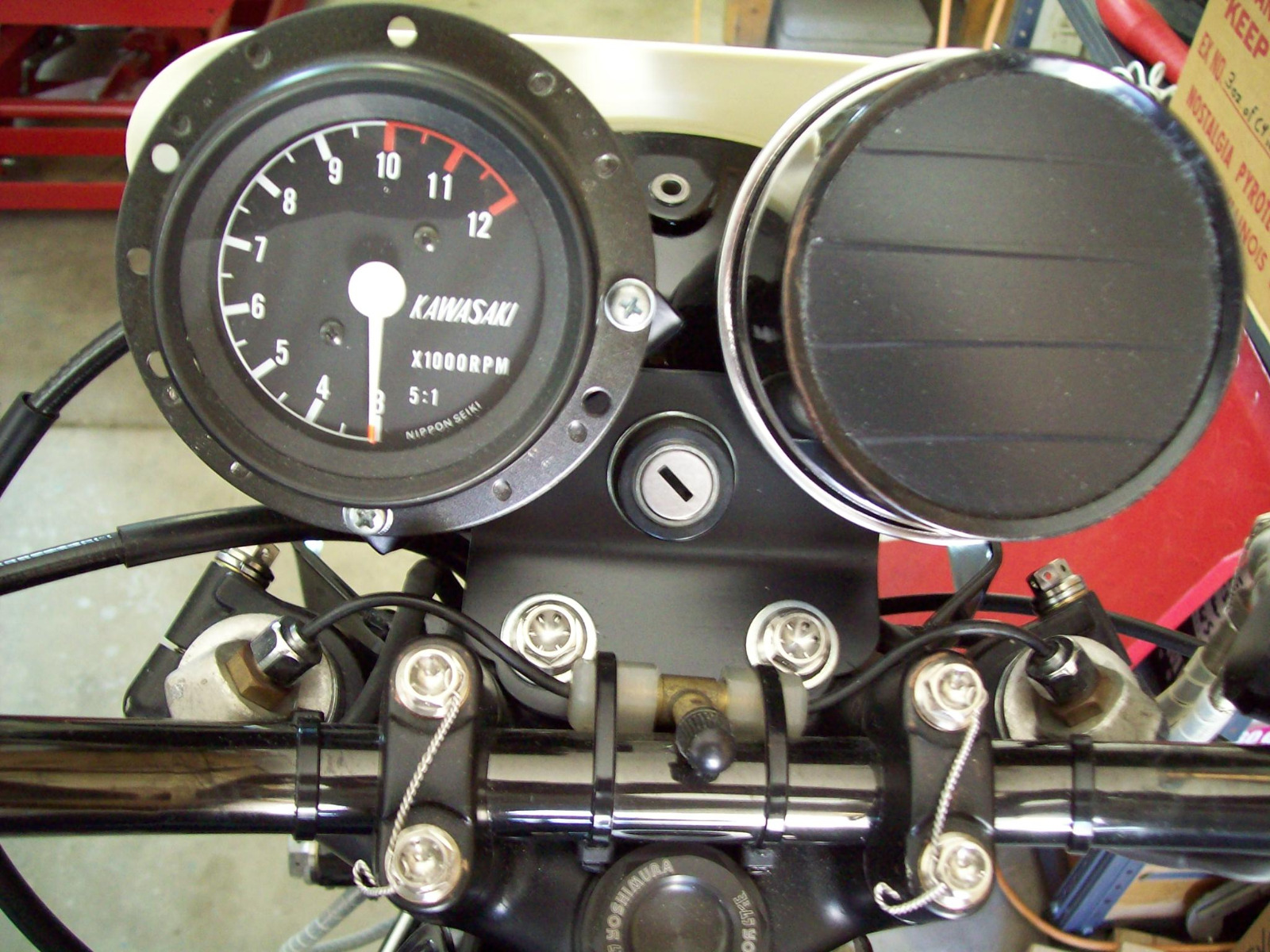 While we are talking about gauges. This is my gauge cluster from my Kz1000 Superbike. A gutted stock Kz speedometer with a super rare Factory Kawasaki road race tach off my Kz1000S1 mounted to a hand carved and bent aluminum gauge bracket. Plus it is mounted to the bike with drilled Titanium bolts!!!!