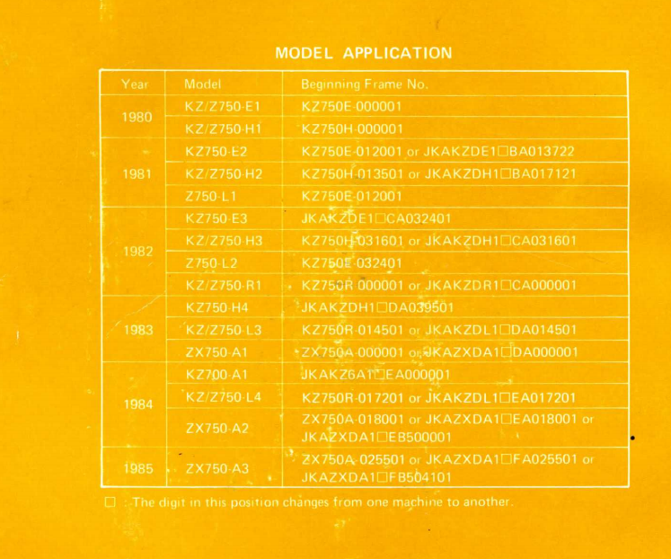 I have relied mostly on the Kawasaki Model Guides posted here, along with factory service manuals, and to a lesser degree on Zedder.co and Partzilla. Even so, I am missing some frame/vin and engine numbers, and I am asking any of you who have the relevant service manual or other official Kawasaki source to please email scans or images of the following --