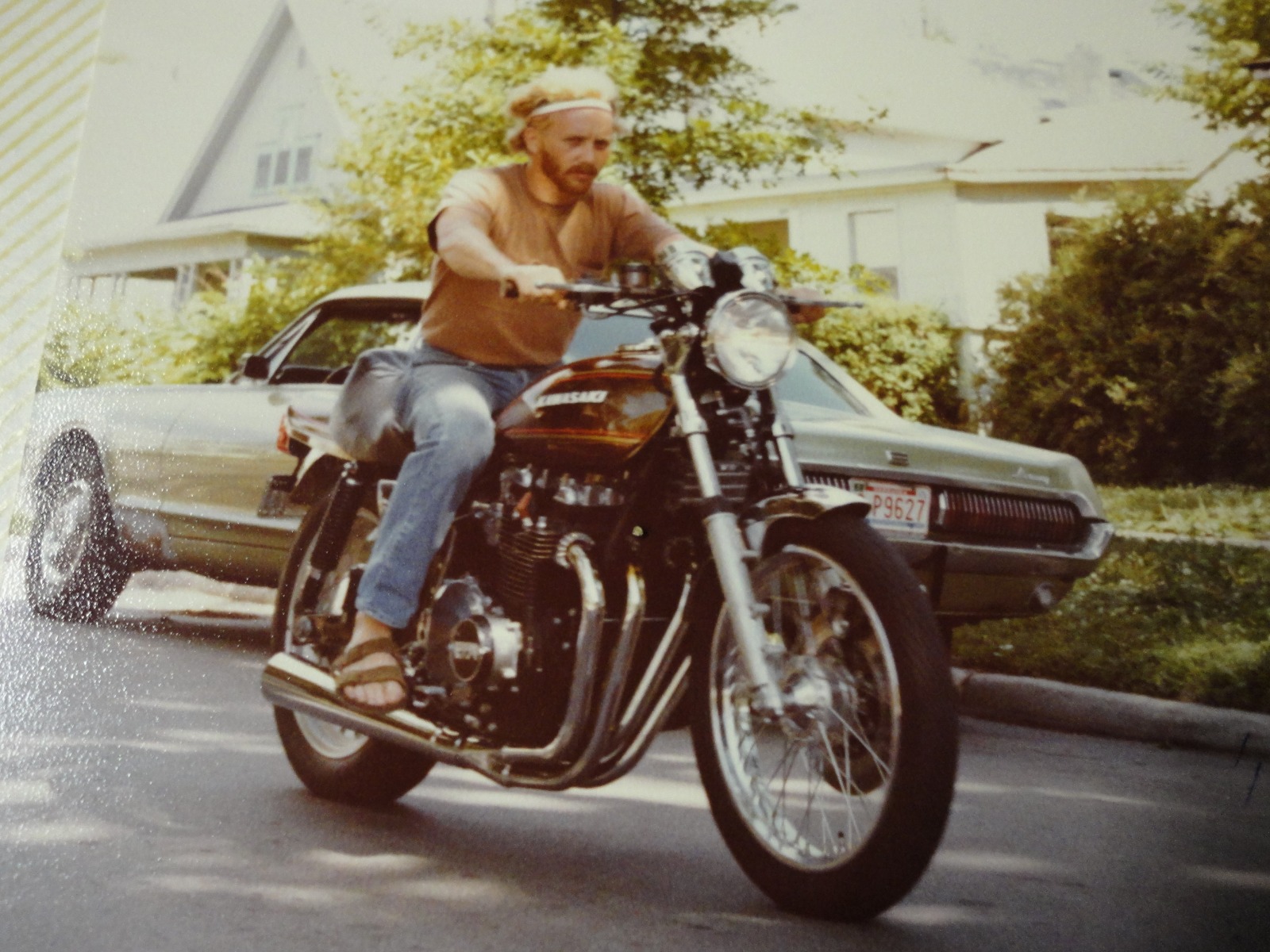 I came across a couple photos from the late 70s to share. The Bronze bike is my buddy Walt's, which he purchased new while working at the Kawasaki Factory. The bike actually contributed to the end of his Kawasaki career when his boss saw him riding it while he was out on Medical Leave for a back injury. He ended up going to Japan for training when he got a job at Tokyo Seat, and became friends with another "round eye" who was working at the Yoshimura shop. He spent all his spare time and money hanging out at the shop and buying parts to bring home for his bike. His bike got a overbore high comp. piston kit, Yoshimura ported cylinder head, cams, smoothbore carbs (the first set I had ever seen) and a really cool Moriwaki points cover. I don't remember what brand the pipe is, doesn't look like a Yoshimura. I'm on the other bike, a 76 I purchased from another buddy. It had been previously painted silver at the Plant (we could do that back then), but I traded for the 73 body parts. The only mods to it were Andrews 2X cams, a Kerker pipe and rejetted carbs with velocity stacks. Yes Walt's was faster, waaaay faster. I remember him beating a twin turbo smallblock Camaro with a fiberglass flip front end, that was a terror on Lincoln's streets at the time.