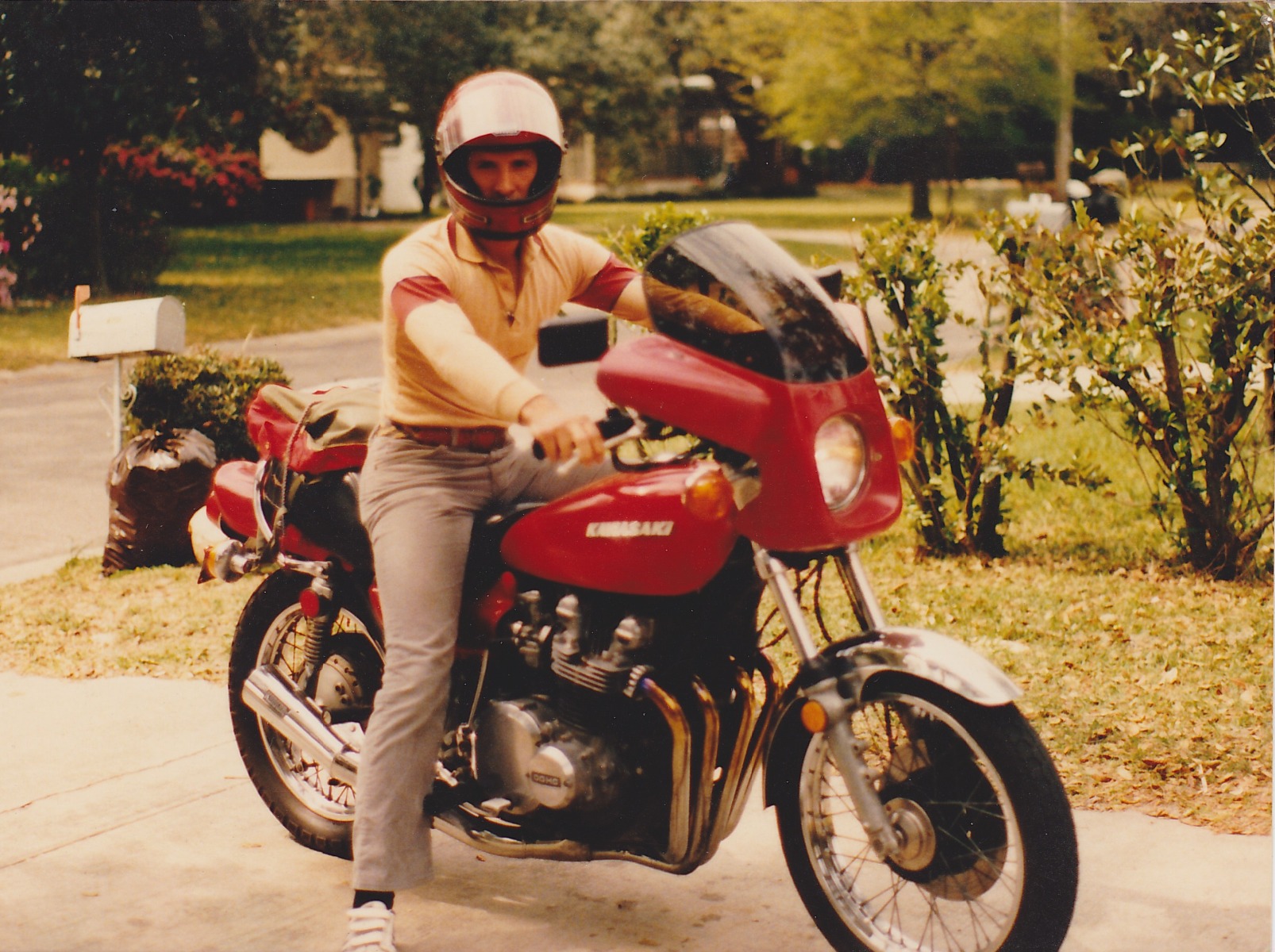 Sporting my rattle can candy apple red paint job with a Kerker and Shoi fairing. Taken at the house my three buddies and I rented. Party central!
