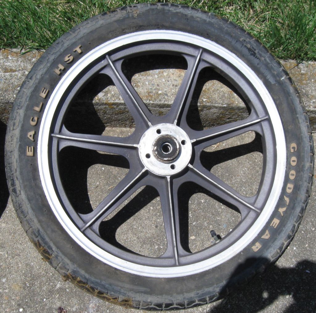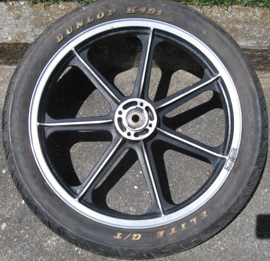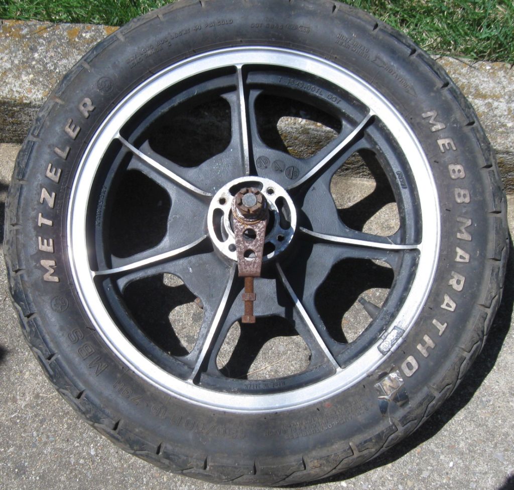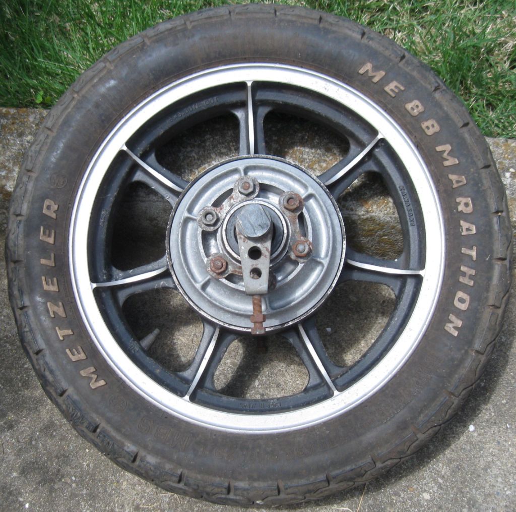Wheel 1.Only marking is an 'M' inside a circle. Bearing holders are removable. Paper taped to tire reads "1976 KZ900". Morris Mag?