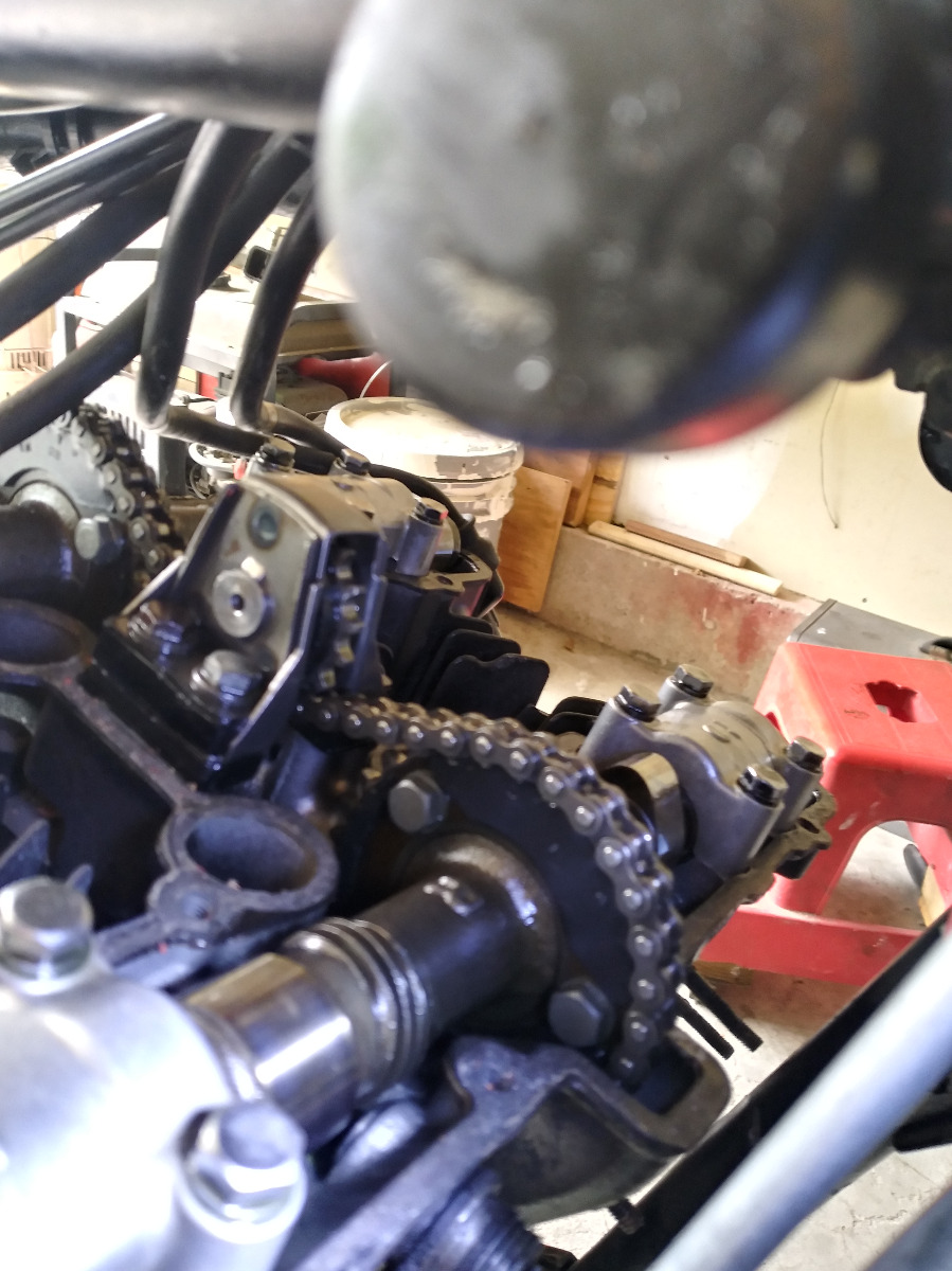 Pulled the valve cover off to check clearances and to strip off the orange paint. Couple things.... cam chain was very loose... would have jumped teeth had it been started. I removed the cam chain tensioner and it appeared to not have been released after last time it was installed. PO was obviously inside. BUT.... the thing that's got me curious is... shouldn't there be a worm drive gear attached to the back of the tach cable attach fitting? Doesn't really show too good in the picture but there's nothing back there to be driven by the tach gear on the exhaust cam. Anyone know what the thing I'm missing is called?