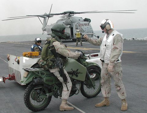 WWII was the heyday of military motorcycles; they didn’t see much action again until the ’80s. And when Desert Storm broke out the Kawasaki KLR became a popular choice, albeit in a heavily modified form. The military KLR, known as the M103M1, was versatile enough to either run on jet fuel or burn diesel and return a hearty 96 MPG.