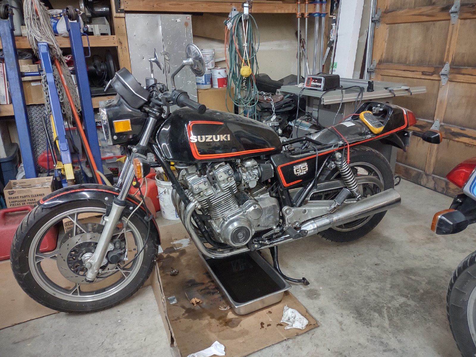 Today we worked on diagnosing what is wrong with an 81' GS 1100E. We resurrected this bike 5 years ago. I'm pretty sure one of the float valves is stuck or a float sunk or is stuck. We pulled the drain plug and dumped a bunch of gas diluted oil, it was overfull.