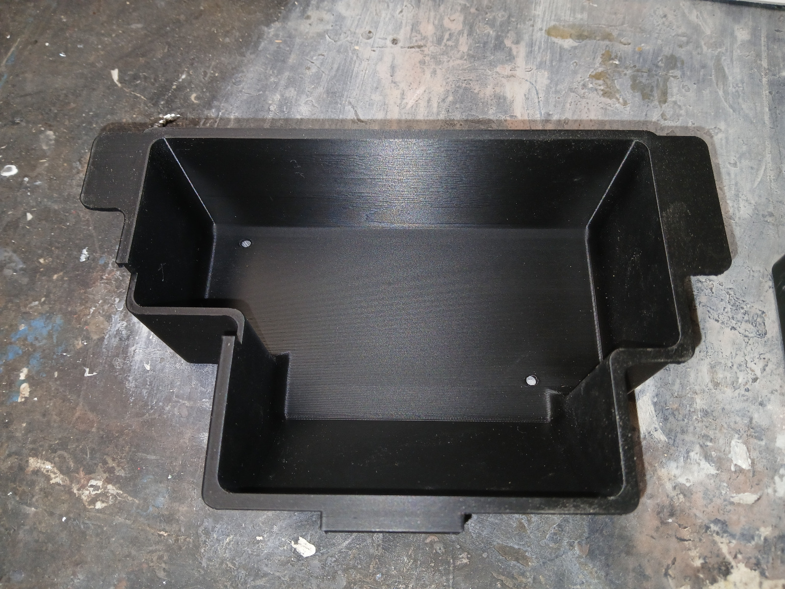 And here's the 3D print. This one is PLA and served to check the fit in the bike. The eventual tray will be in ABS.
