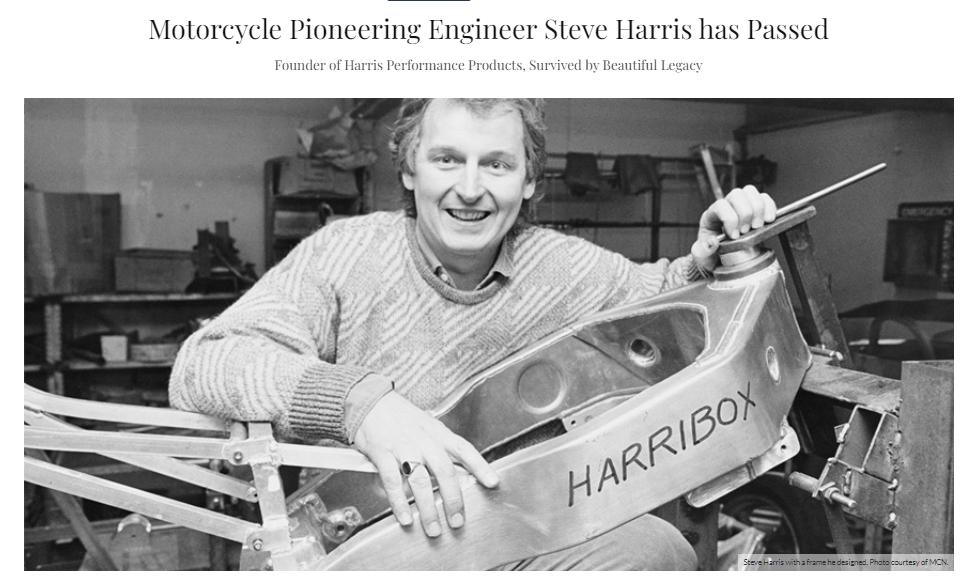 I have just seen that Steve Harris of "Harris Performance" has passed earlier this month. I met Steve in the late 90's at the Birmingham bike show, although at that time Harris were running a GP team and the stand was really busy Steve took the time to talk to me about my planned mods to my Magnum 2 frame. We scratched out drawings on a scrap of paper and he gave me the benefit of his knowledge for at least 20 minutes while the ques built at his stand. The man was truly what we in the UK would call "a proper bloke"