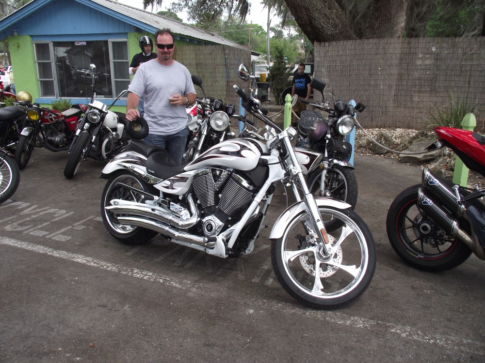 Boostable next to his gorgeous Victory. Was good of him to stay on the way considering there was a mishap with one of the members in his riding group.