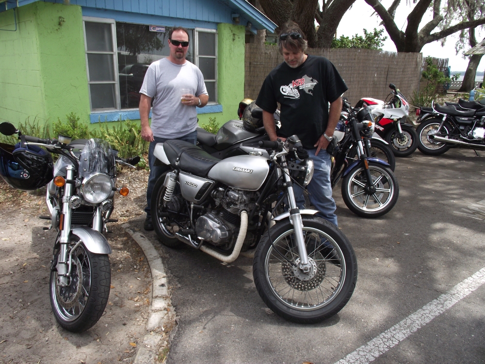 Kawickrice met me around 10:30 a.m this morning at Lady Lake, Fl at my son's little league game. We rode 15 minutes from there to Gator Joe's in Ocklawaha, Fl situated on Lake Weir. Things got delayed due to a mishap by one of the riders on Boostable's riding group. Seems he will be o.k. but sustained a broken collar bone. Figured it may not happen, and of course would have been fine with that, but after the member was on the way to hospital and his bike on a trailer, they pushed on. Hand off ended up happening at 1:30 p.m. Kawicrice, his girlfriend and myself didn't mind the wait much, since this was great venue and we had lots to talk about. Had to leave everybody by 2:15 p.m. and get home so my wife can leave for work. Clocked 90 miles on the KZ. All in all, this was a very good day.