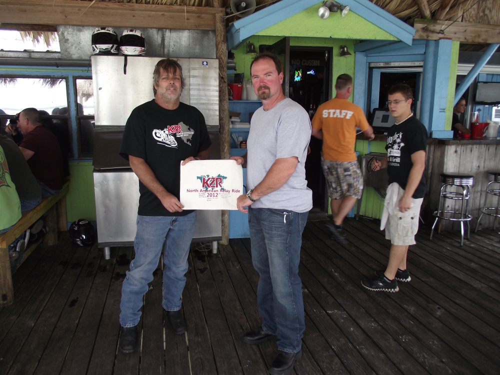 Kawickrice met me around 10:30 a.m this morning at Lady Lake, Fl at my son's little league game. We rode 15 minutes from there to Gator Joe's in Ocklawaha, Fl situated on Lake Weir. Things got delayed due to a mishap by one of the riders on Boostable's riding group. Seems he will be o.k. but sustained a broken collar bone. Figured it may not happen, and of course would have been fine with that, but after the member was on the way to hospital and his bike on a trailer, they pushed on. Hand off ended up happening at 1:30 p.m. Kawicrice, his girlfriend and myself didn't mind the wait much, since this was great venue and we had lots to talk about. Had to leave everybody by 2:15 p.m. and get home so my wife can leave for work. Clocked 90 miles on the KZ. All in all, this was a very good day.