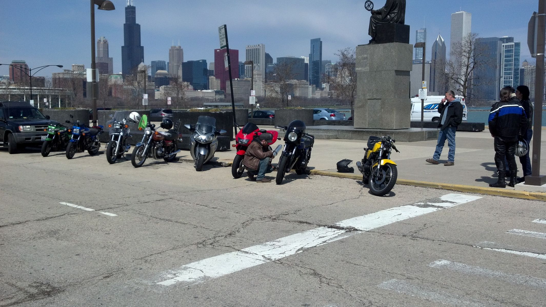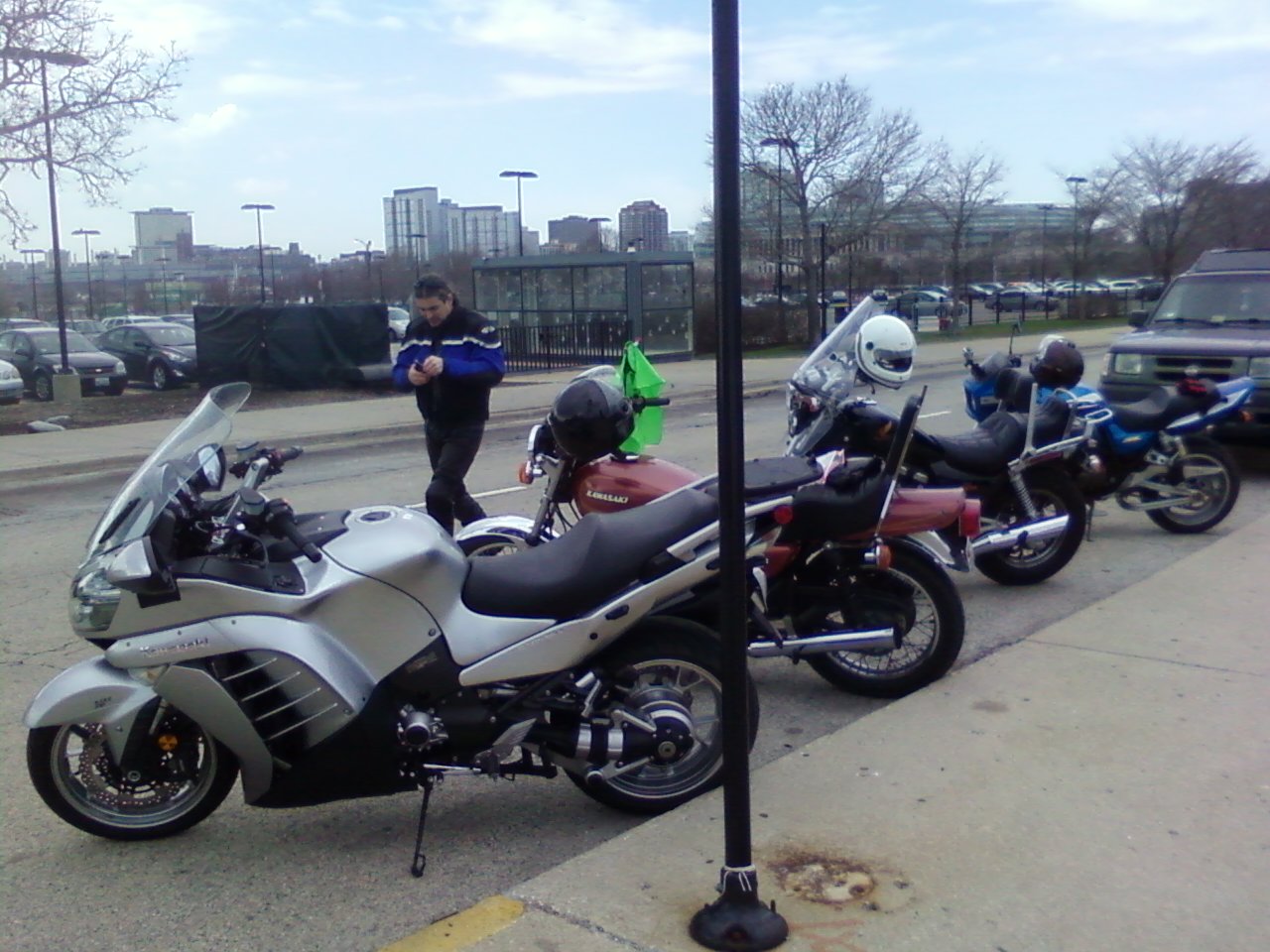 Today the Flag made it to the shore of Lake Michigan in Chicago. The hand off was made from BlueJ58 aka Jack(center) to Loudhvx aka Lou(right) at the Adler Planetarium. Lawrence aka Sax Jones is also pictured on the left. The day started out cold. I failed to get my KZ 650 started. I was forced to ride to my C-14. There were several others who did ride their KZs today. Thanks also to Trevor(nice Mach III), Don on his ZRX1100, and Greg on his Sabre V65. Had an interesting ride down and up Lake Shore Drive. Also, ran Lower Wacker Drive before we all split up. Nice meeting everyone even that guy on the Red Super Hawk!