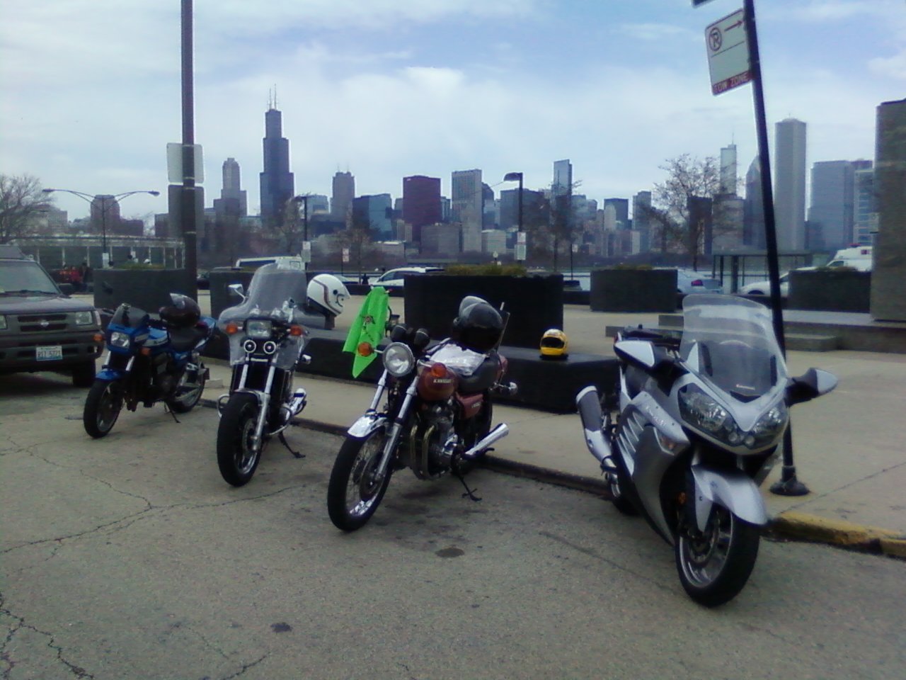 Today the Flag made it to the shore of Lake Michigan in Chicago. The hand off was made from BlueJ58 aka Jack(center) to Loudhvx aka Lou(right) at the Adler Planetarium. Lawrence aka Sax Jones is also pictured on the left. The day started out cold. I failed to get my KZ 650 started. I was forced to ride to my C-14. There were several others who did ride their KZs today. Thanks also to Trevor(nice Mach III), Don on his ZRX1100, and Greg on his Sabre V65. Had an interesting ride down and up Lake Shore Drive. Also, ran Lower Wacker Drive before we all split up. Nice meeting everyone even that guy on the Red Super Hawk!