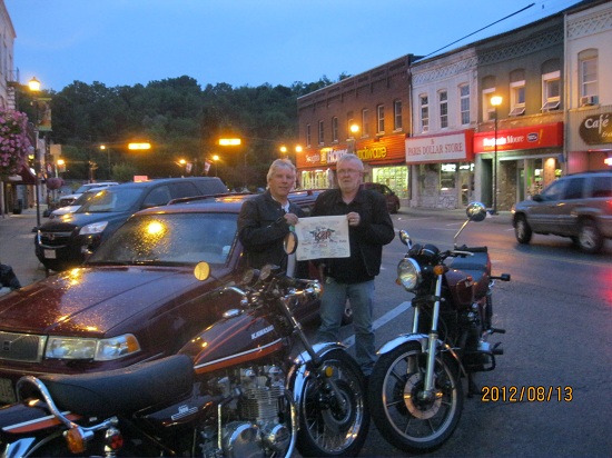 We talked about a lot of stuff but mostly KZs and bikes in general. David's Z1 is just absolutely amazing and I wish I had more time and more daylight for a better look and better pics. By the time we finished yacking it was almost dark and had started to rain so we headed out to the street for the "Photo Op' and corralled a couple of kids to take the pics.... and here's the anectdote I promised in the Leg 2 post - One of the kids said Hey my dad and I just picked up a KZ550 in a barn and are working on restoring it.
