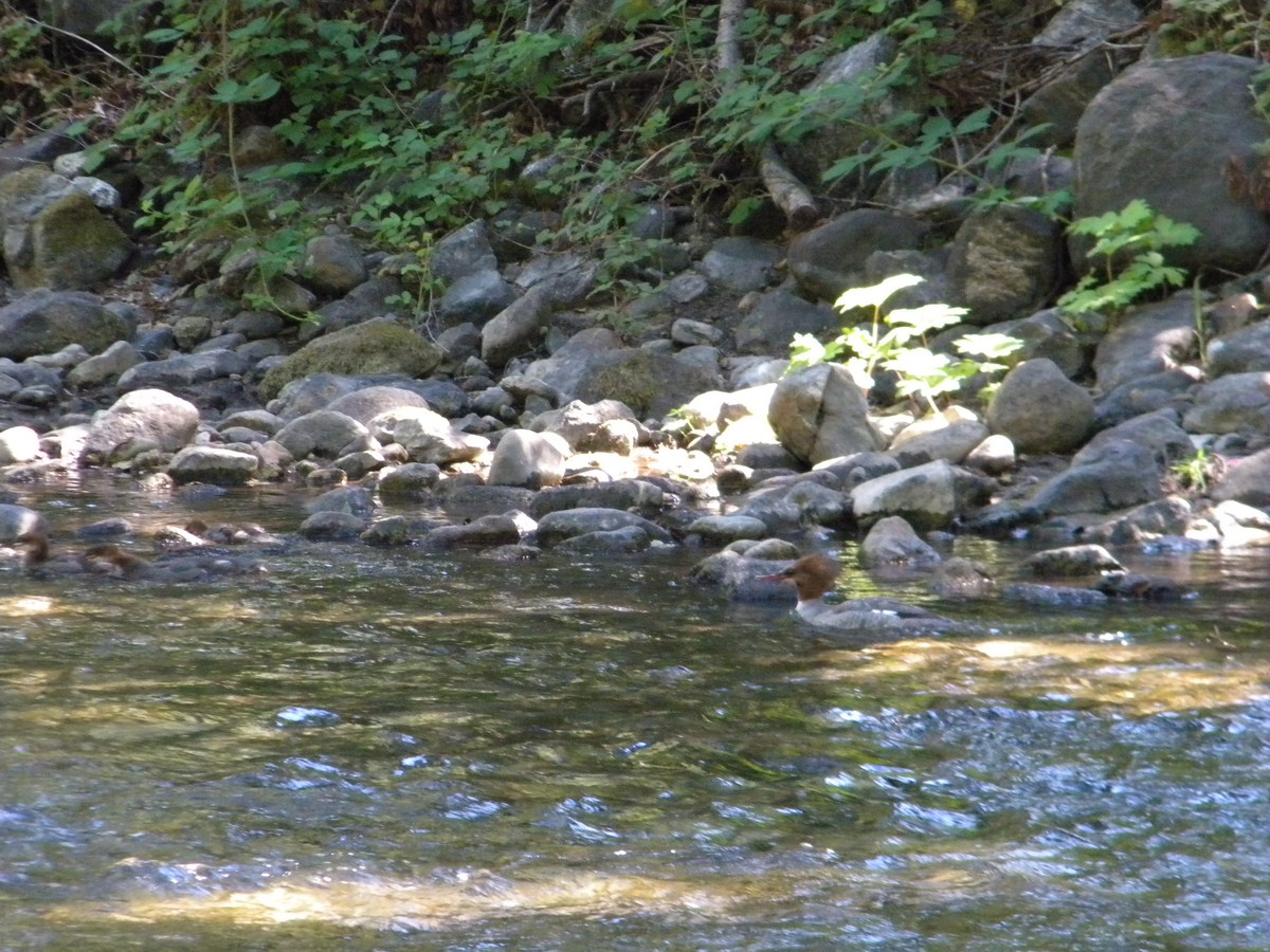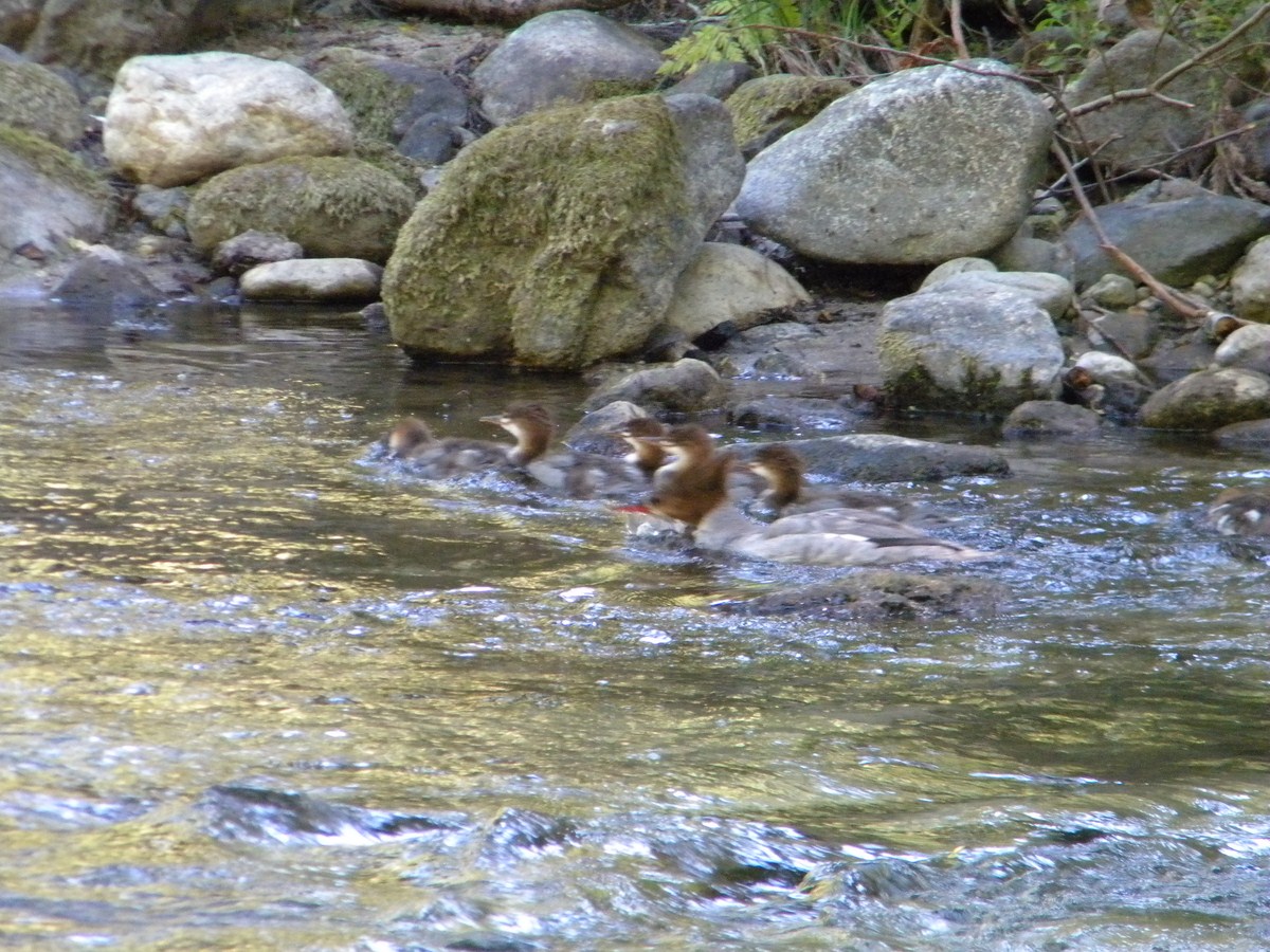 a wild looking wood duck??? with babies in tow