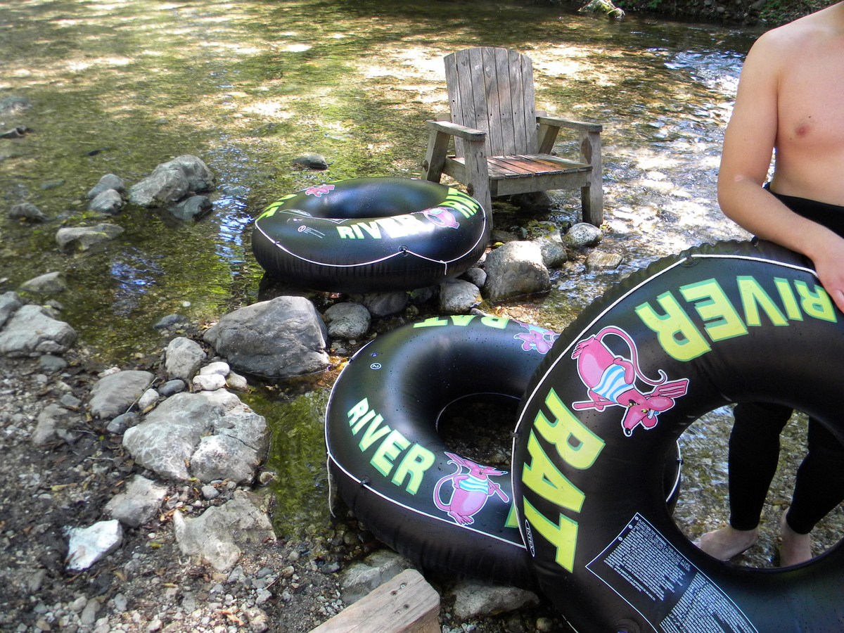 grandma with her teenage grandkids floating in tubes down the big sur river