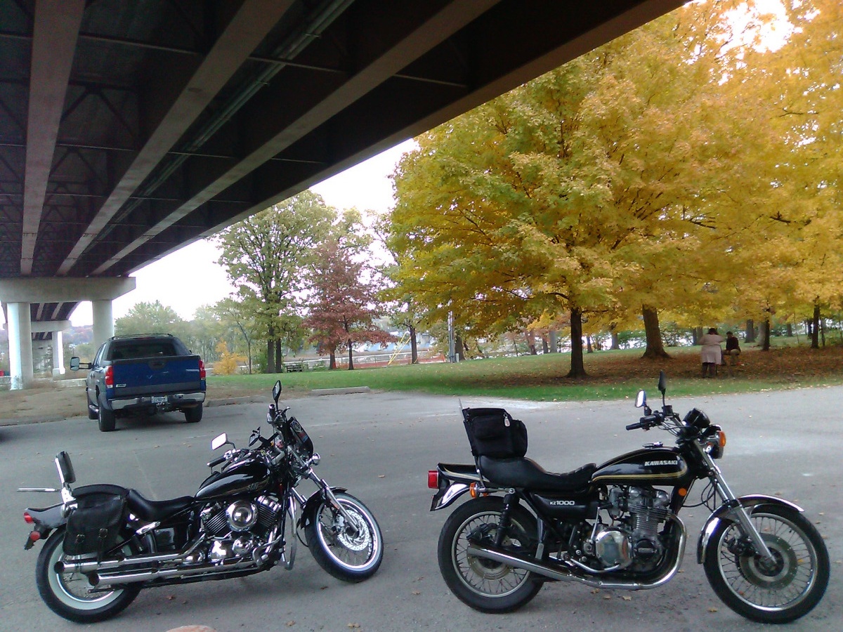 This was back in 2012. Both are a 1985 GPz550 and The Golden Gate Bridge in the background, then Alcatraz Island in the other. This is just after we returned from a 6 day road trip. Good times indeed.