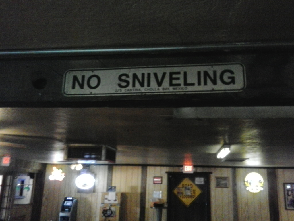 That "NO SNIVELING" sign came from JJ's Cantina in Rocky Point Mexico, about an hour south of the AZ border. I wonder if that place is still in business?
