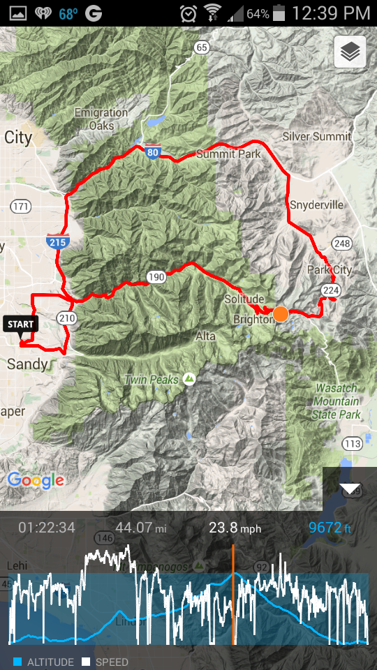 I decided to get on the bike and go before any more weather could come. I set out to go around and up I-80 through Parley's Canyon into Park City, over the back side of Guardsman Pass and down Big Cottonwood Canyon. Almost 70 miles and 2 hrs of riding.