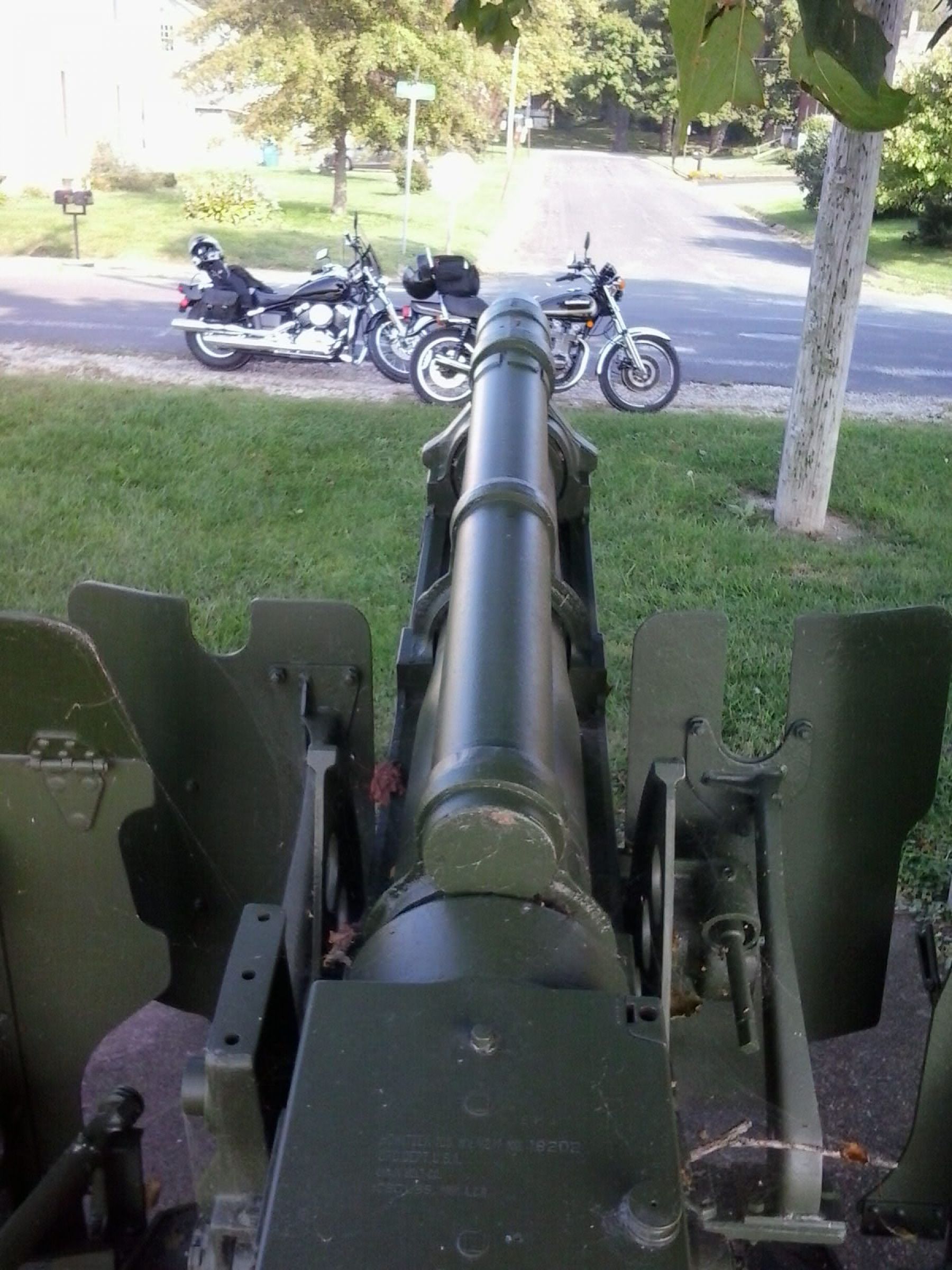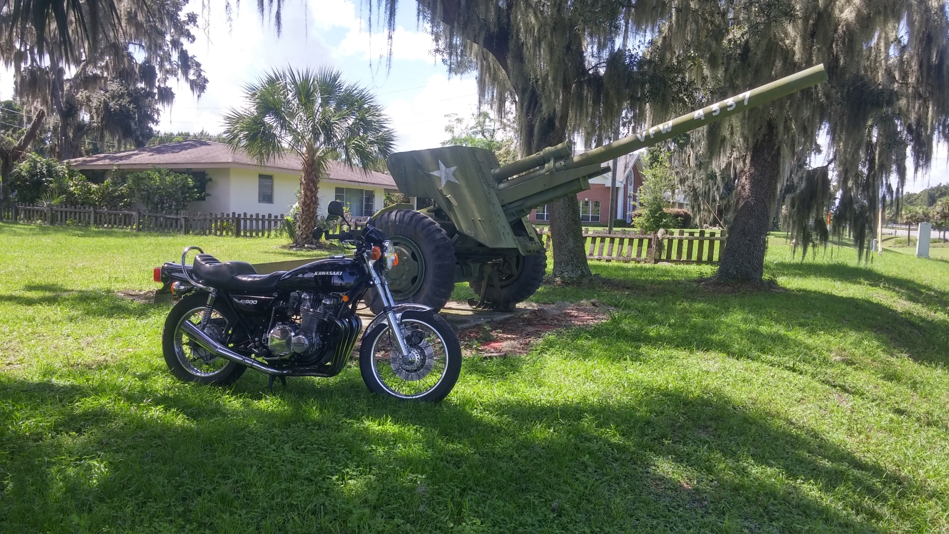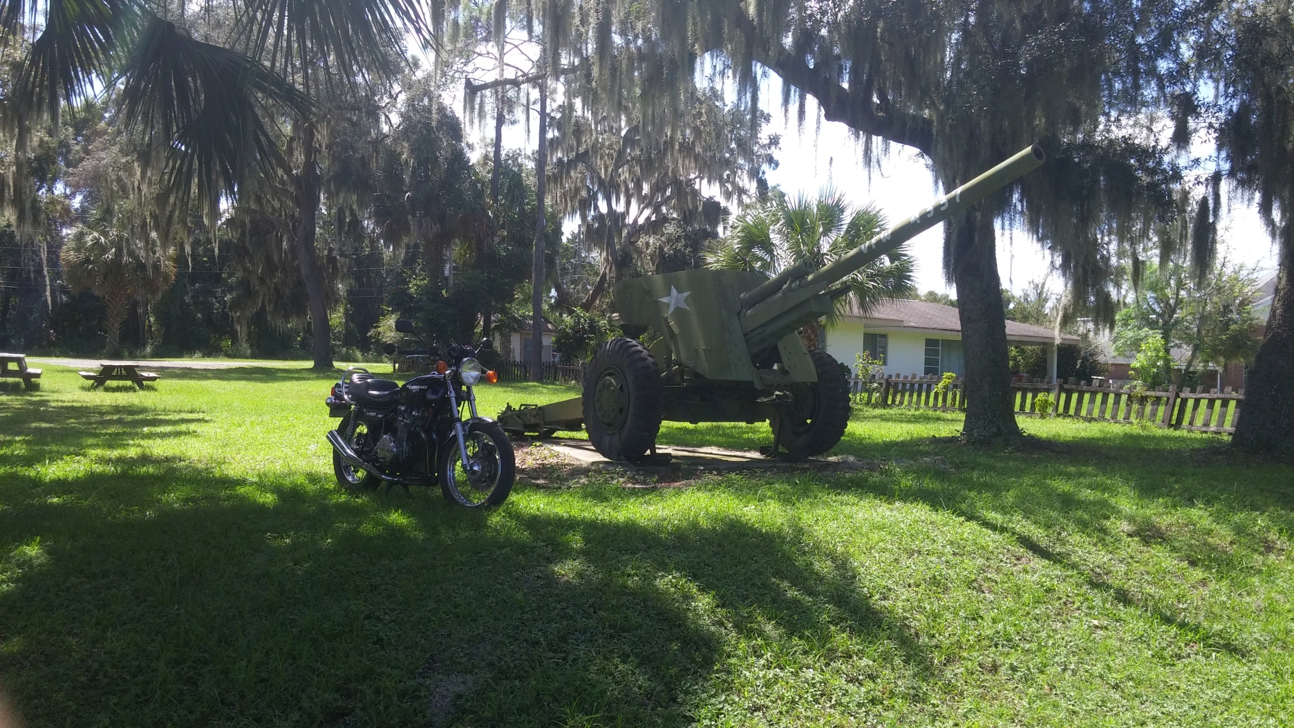 I had to take the KZ out today as part of my shake down runs I'm doing before next week's DGR. So figured I would make it a bit more interesting and get some nice pictures while I'm at it. I am submitting the first entry of a local piece of artillery displayed at the VFW building near town. Please feel free to post your own pictures with your bike.