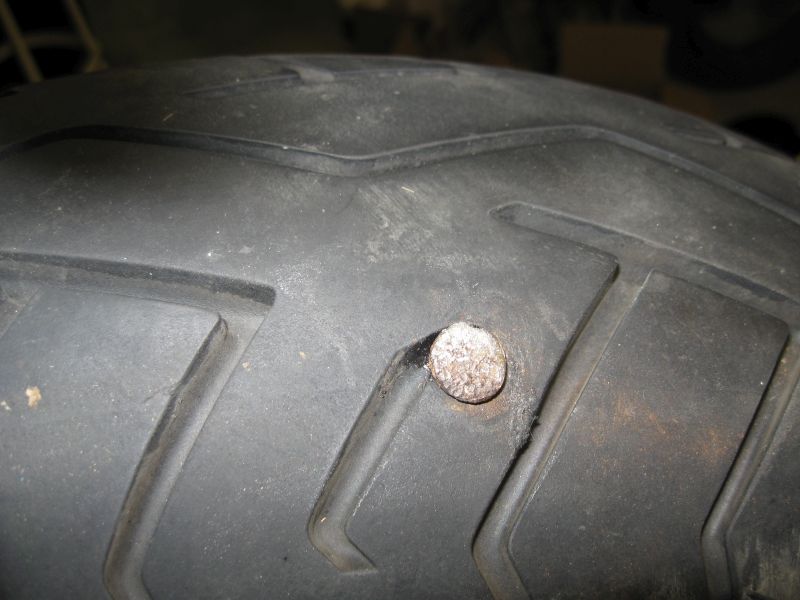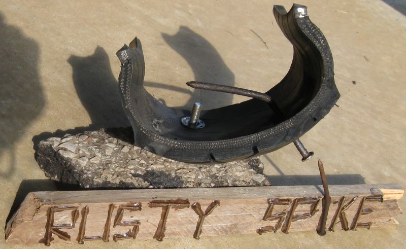 I'm considering cutting a section of the damaged area out of the tire, mounting it on a nice piece of wood complete with spike and having a plaque made, thereby creating a "Rusty Spike Award". It will be to recognize the next VJMC member who experiences a puncture during a VJMC National event.