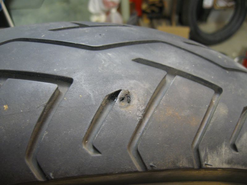 I was riding along a two-lane IN state road road that was wet from a passing rain shower. Moving at ~55 mph. Hear a soft "pop", and the rear tire just sorta twitched a tiny amount, but nothing more. Figured I'd just hit an unseen piece of larger gravel a glancing blow. I rode on to my destination about 5 mi. away without further incident.