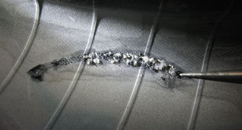 The tip of the awl is pointing to the deepest damage to the inside of the carcass. It's a hole about 3 mm. deep. This is NOT the puncture made by the spike; that puncture is out of the frame of this pic. The rest of the damage runs between 1~2 mm. deep. Cords in the carcass are obviously cut. Best guess is that the arc was created as the point of the spike swept across the surface each time the spike hit the road. The staining is from dried rubber slickum I used during tire dismount.