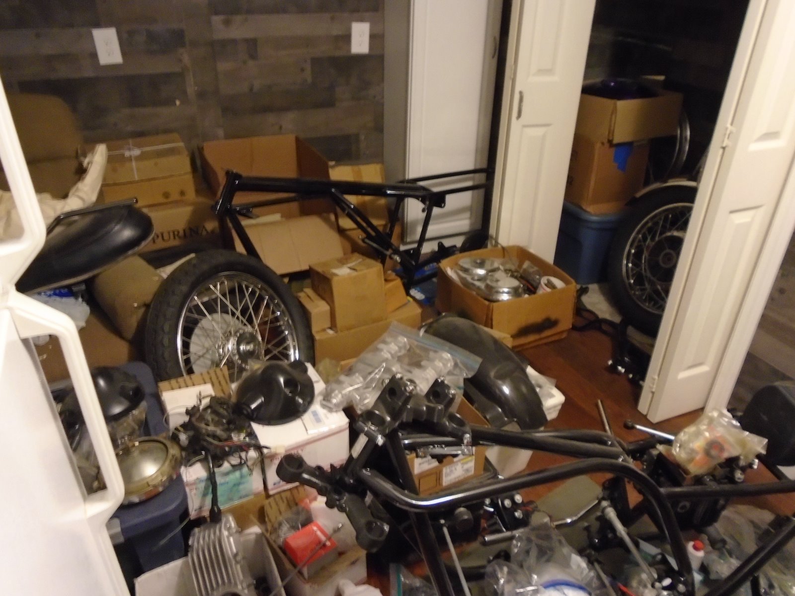 Just adding in on the charm of changing weather. Since the move I Miss my heated garage!! The new place had a rank amature carpentry job on rafters/support beam. Got that sorted now waiting on the electrician to bring wiring up to code then insulate and drywall. Pleasure chatting with the persons that responded to "parts for sale" but still haven't had to time/space to sort thru the boxes of stuff yet. I cannot spread out items on the garage floor yet because i'll just have to pick them up again so they aren't in the way of progress. I needed a heater for the garage, paid the carpenter for an unseen heater and he brought this mammoth of a heater over. 125K BTU is a bit of overkill for a 550sq ft area. All my projects are in the heated mudroom, next to the Beer fridge. Note the 73