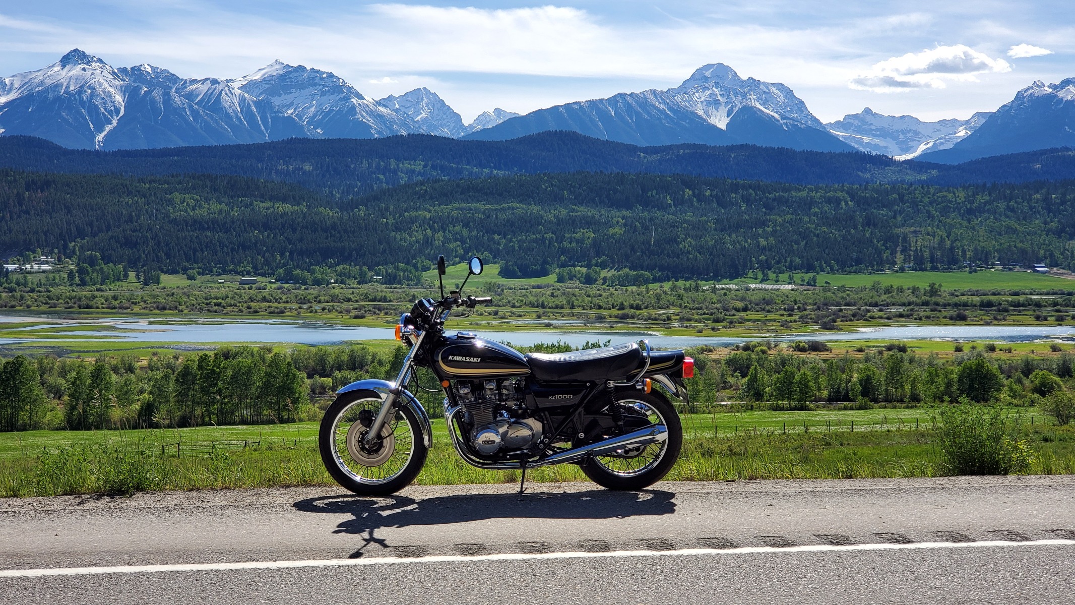 Did a "practice" run today, in case the weather report is correct for Saturday. It was 17c (63f) and sunny today, whereas it's supposed to be 8c (46f) and rainy on Saturday. Can we fudge it to the 96th day of the year? Anyway, I did 162.8 kms (101.2 miles) in 97 minutes, Windermere to Spillimacheen to Fairmont Hot Springs to Windermere. The bike is a '77, built in Feb/77 and I'm 63. I followed an RCMP car all the way to Spilli, so no winding it out on that leg, but managed to hit 171 kph (106.25 mph) on the way home. I wanted to cover any speedo error. I saw the perfect picture of the Buggaboo Range, but didn't stop to get it. If I repeat the run on Friday or Saturday, I'll stop for the shot and add it to this post.