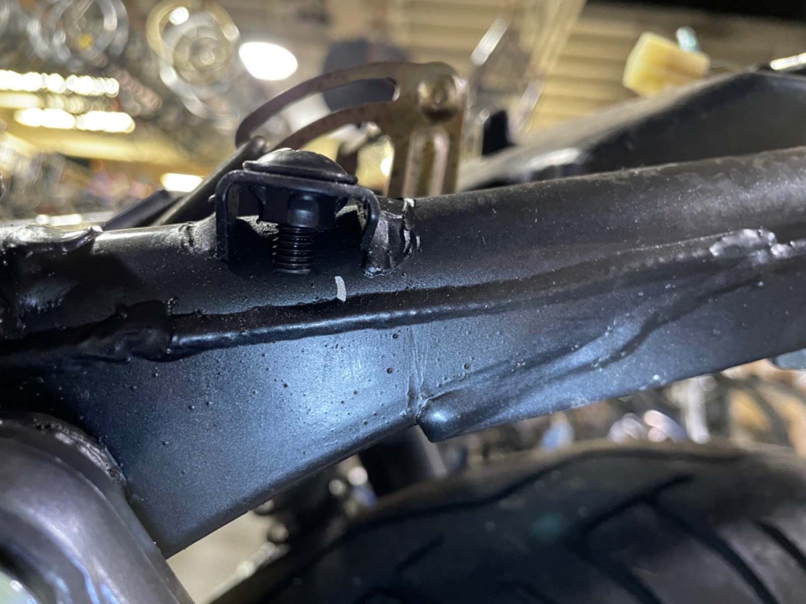 20 Dec 2021 05:16I’ve got the rear cowl, and combination fender and taillight mount removed, along with a small amount of other peripherals. Looking at the bike from straight on at the rear, I noticed that the left side is ever so slightly higher than the right. I put a straight edge on it to confirm. So I looked closely and it appears there is a place where the frame flexed and buckled up a small amount. I tried to take a photo of it, below.