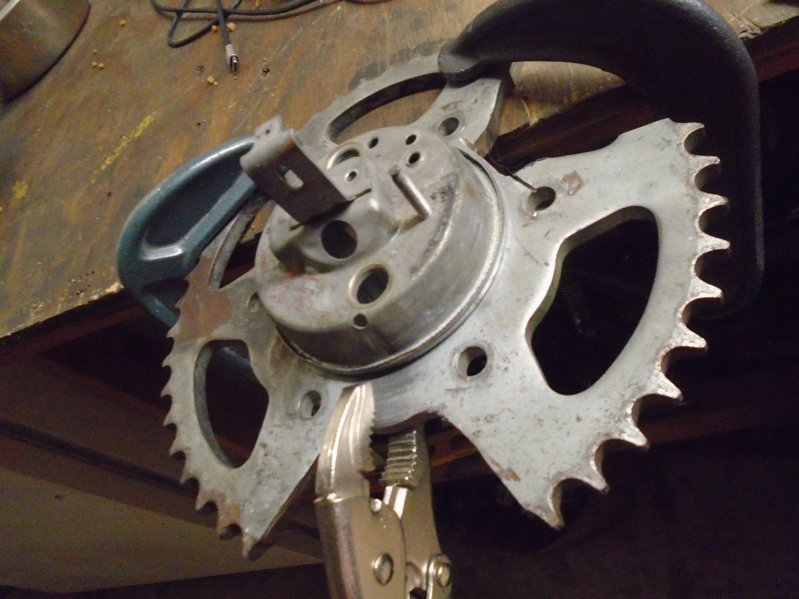 My way of finishing-up the crimping, crude but effective. An old Z1/KZ sprocket to hold the gauge upper can/crimp ring flat, It's like it was made for it, ha. Then, without damaging the ring, just fold the folded back portion into submission.